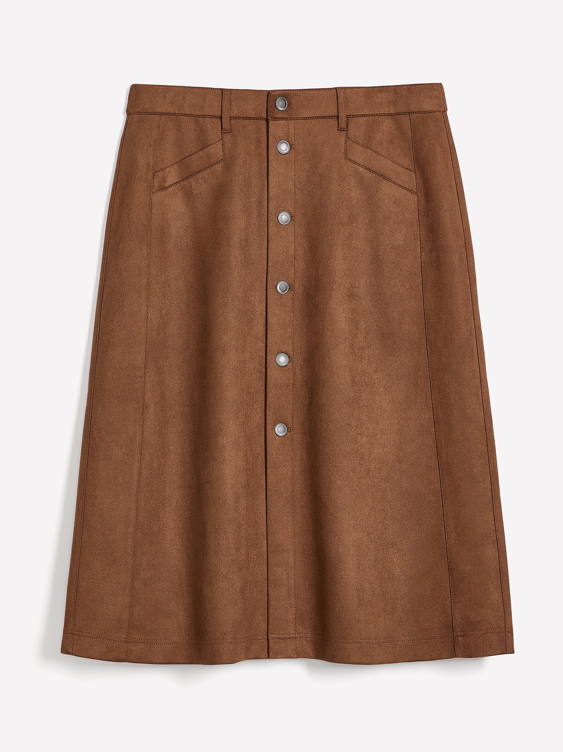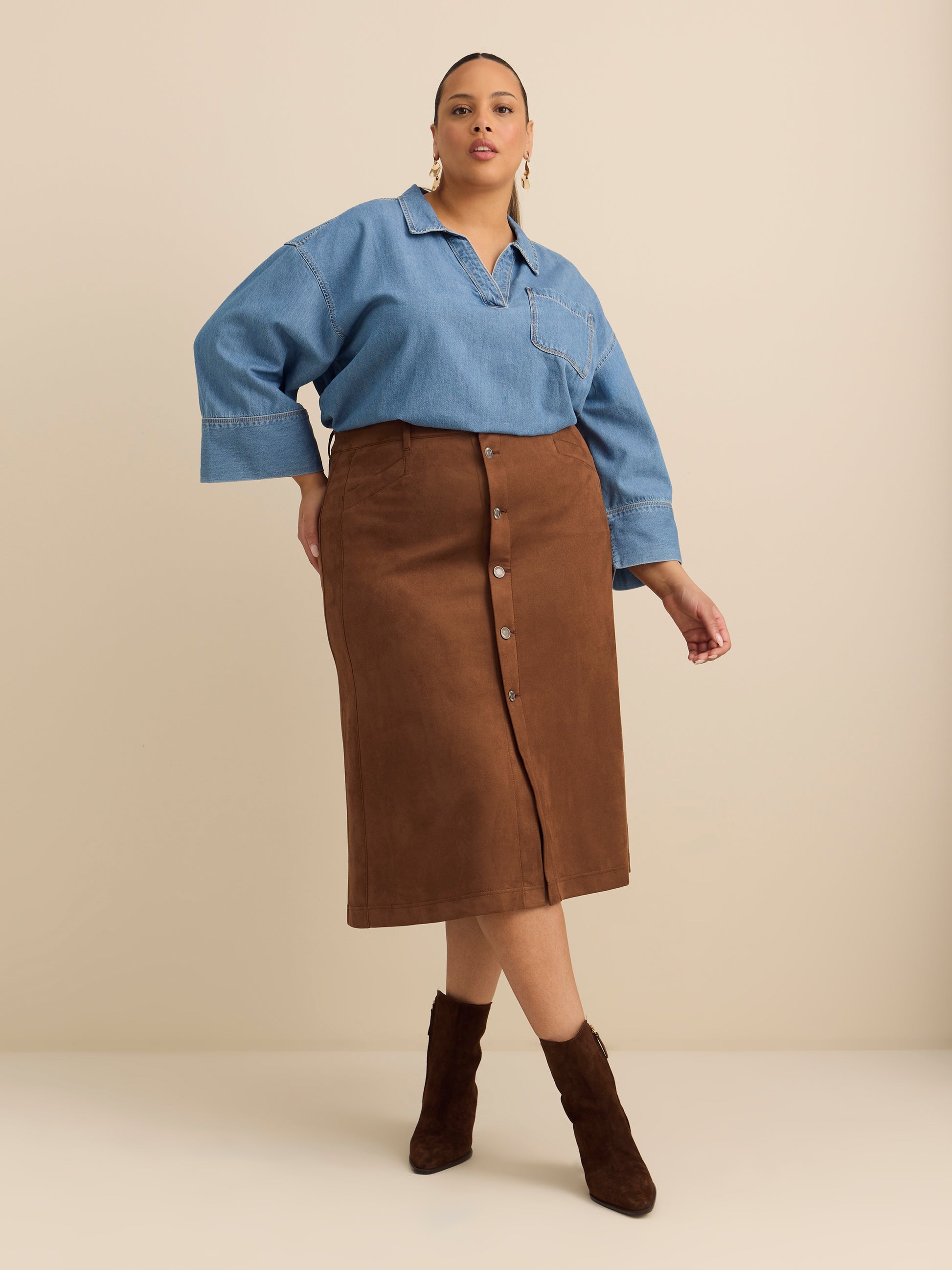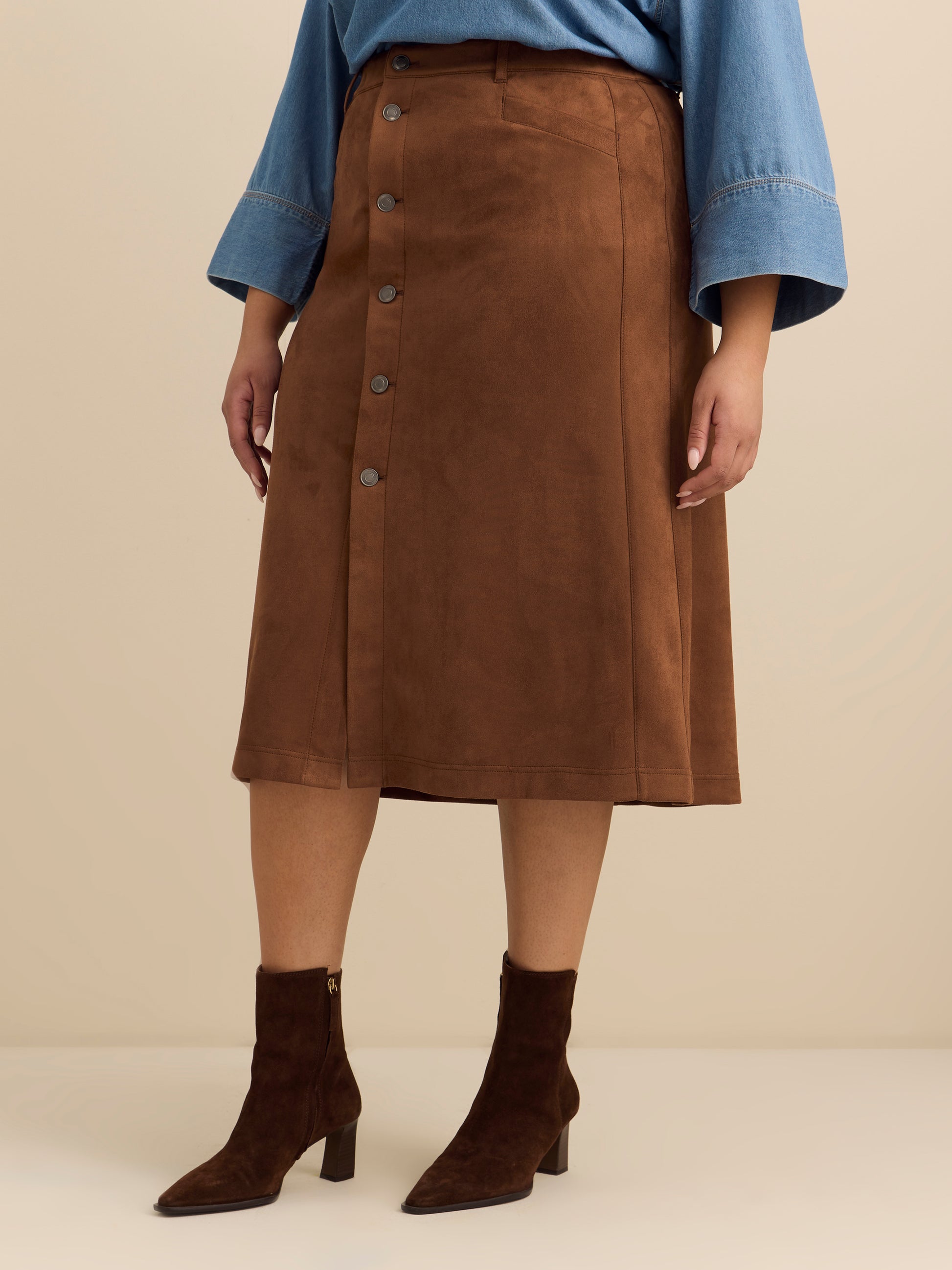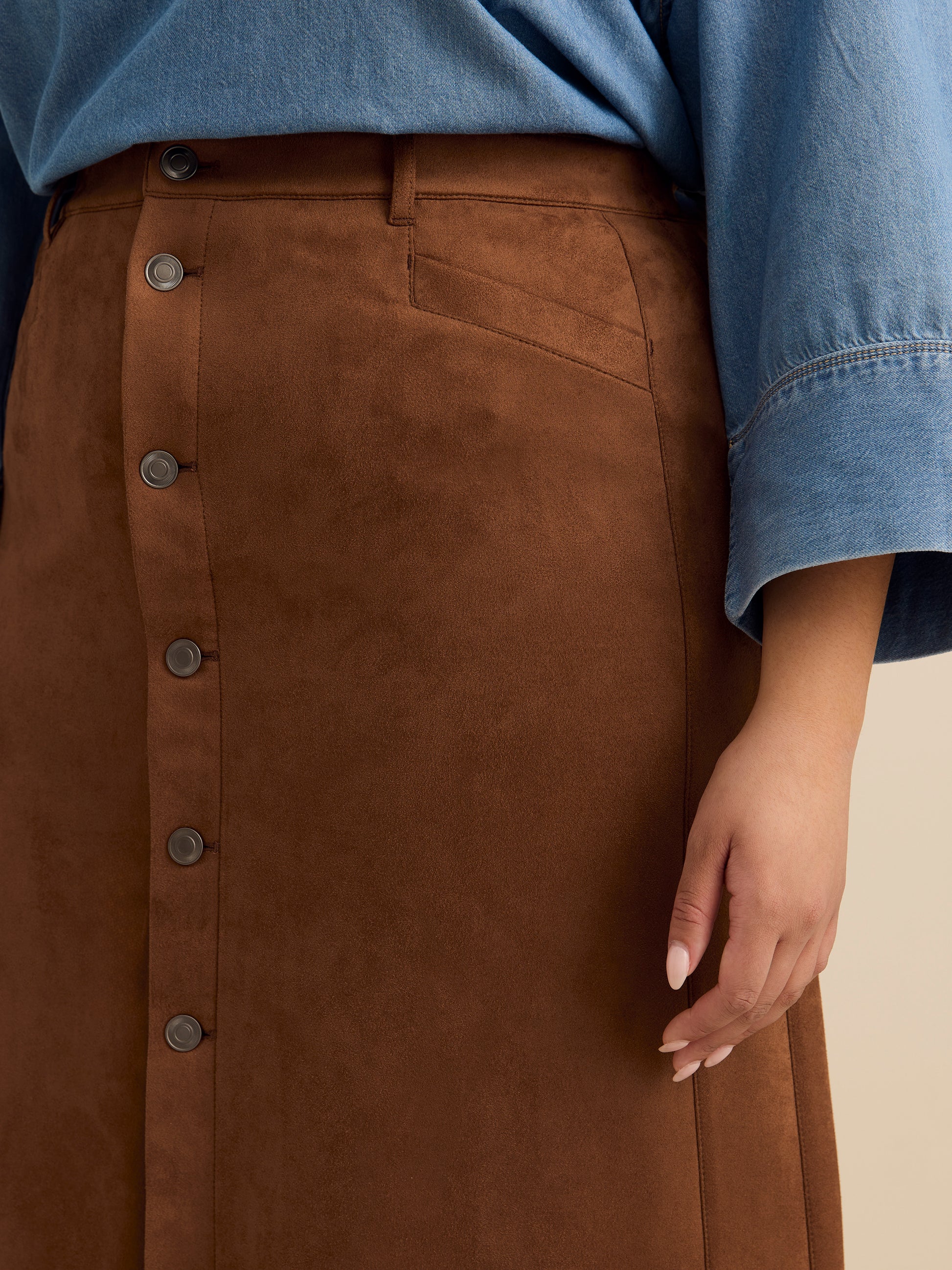 Douce, élégante et flatteuse sans effort. Cette jupe midi taille plus en faux suède offre une silhouette trapèze avec un devant boutonné et des poches pratiques—idéale pour ajouter une touche chaleureuse et soignée à vos tenues.