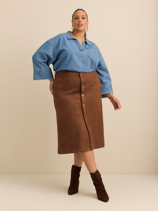 Structurée, légère et pleine d'allure. Cette veste safari taille plus enfaux suède marron souligne votre taille avec sa ceinture en plus d'être pratique avec ses poches à rabat classiques, le tout dans une coupe légère non doublée-idéale un look plein d'élégance.