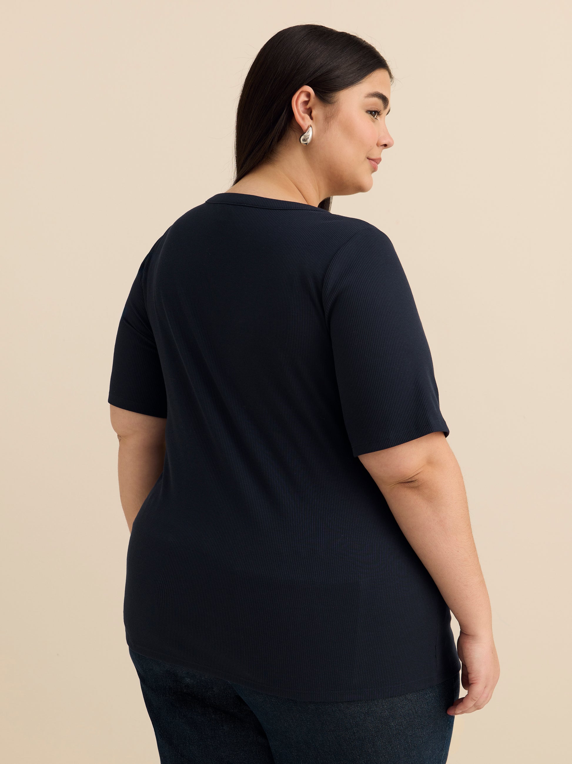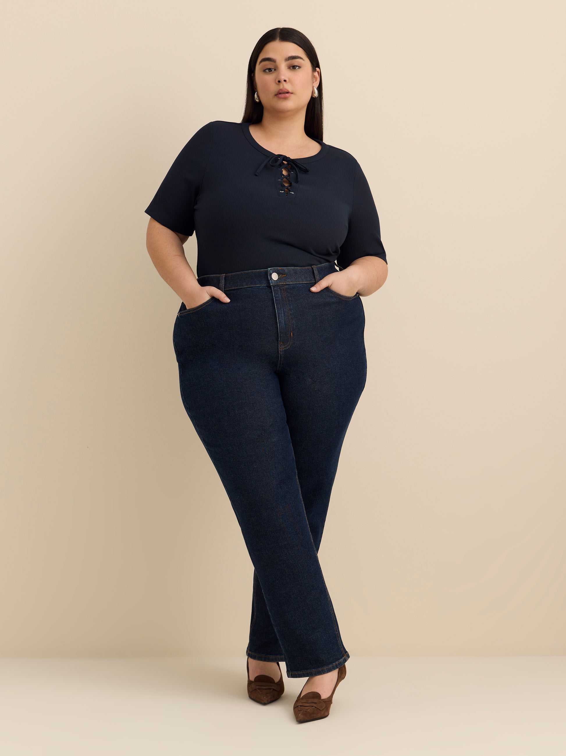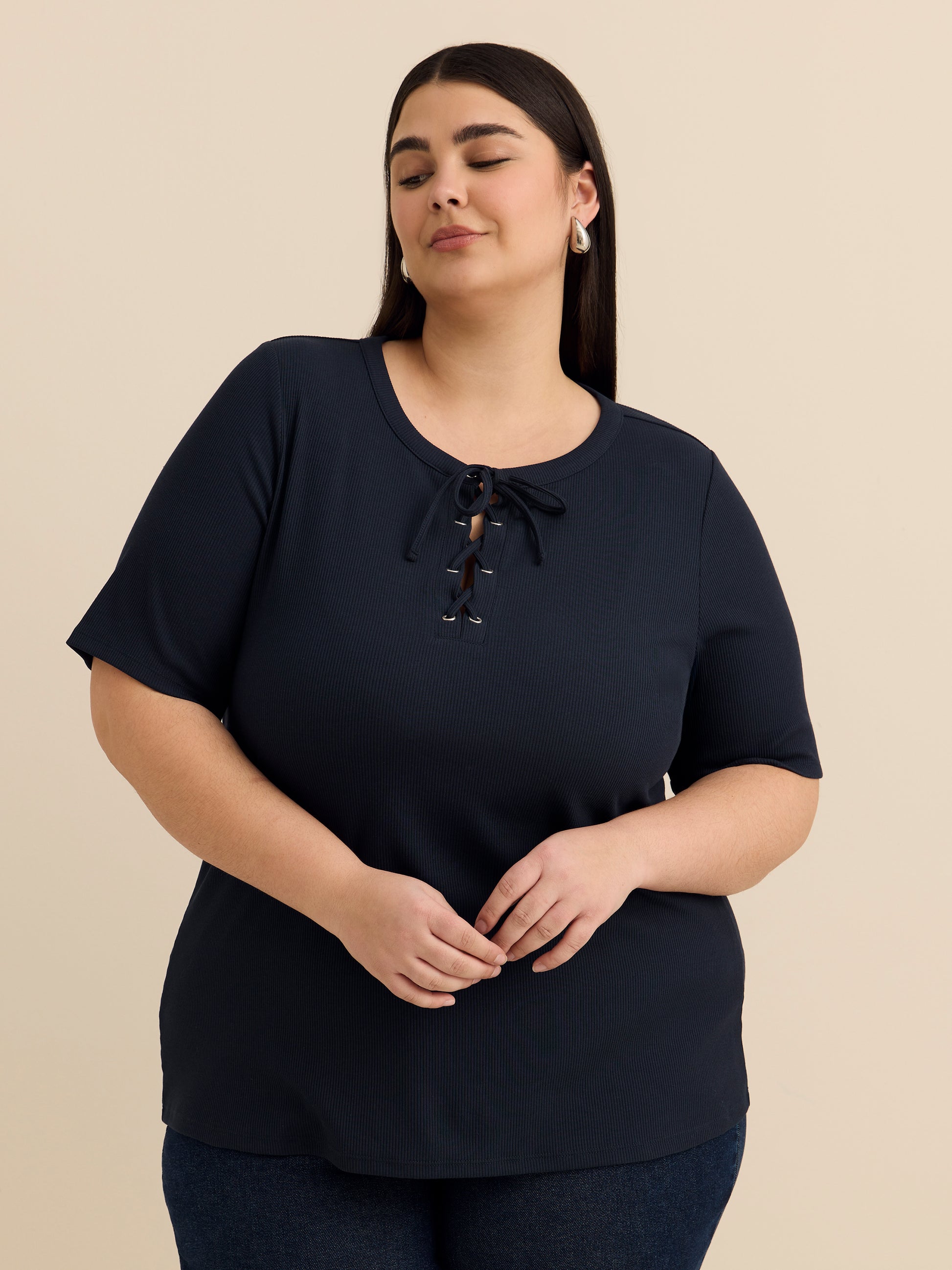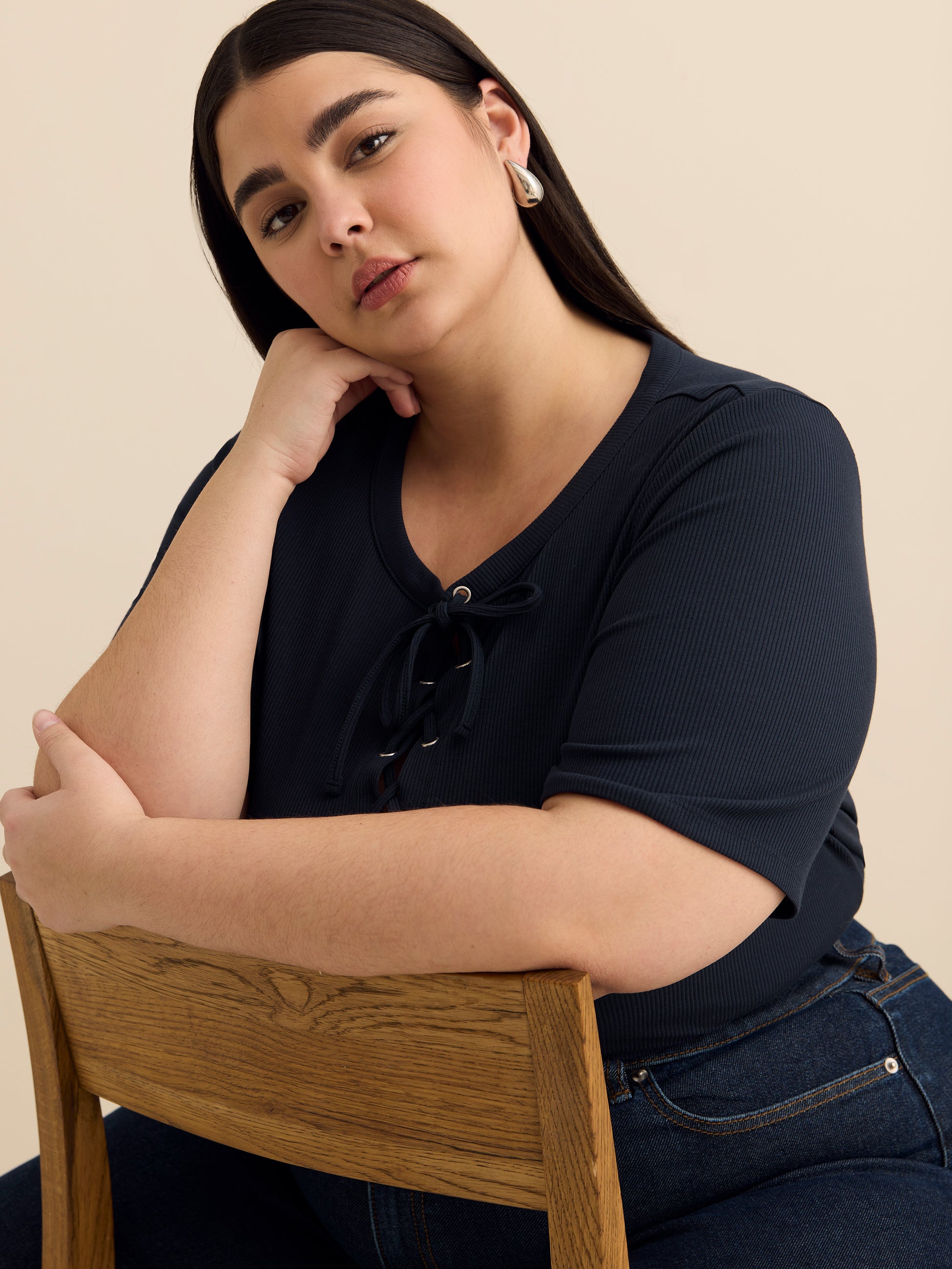 Ce haut taille plus à manches coude séduit par son encolure lacée et sa coupe droite confortable. Avec ses manches montées et sa longueur régulière, il se porte facilement au quotidien et s’adapte à une multitude de tenues, du style décontracté au plus soigné.