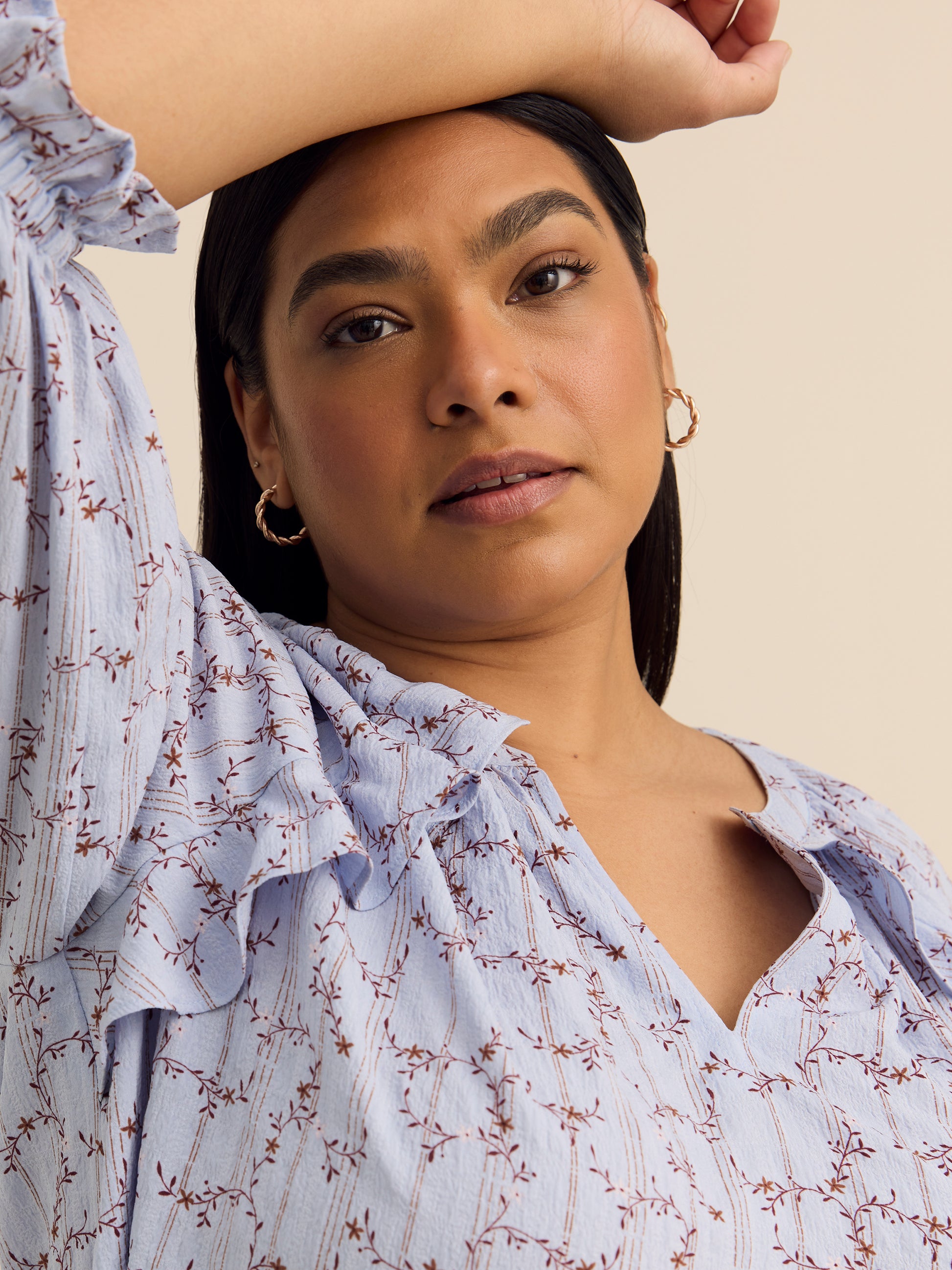 Fluide, féminine et flatteuse sans effort. Cette blouse légèrement évasée taille plus se distingue par son encolure fendue et ses manches raglan 3/4 ornées de volants pour un tombé souple, une touche de romance et une élégance au quotidien.