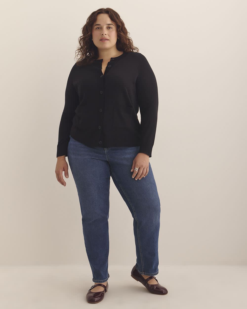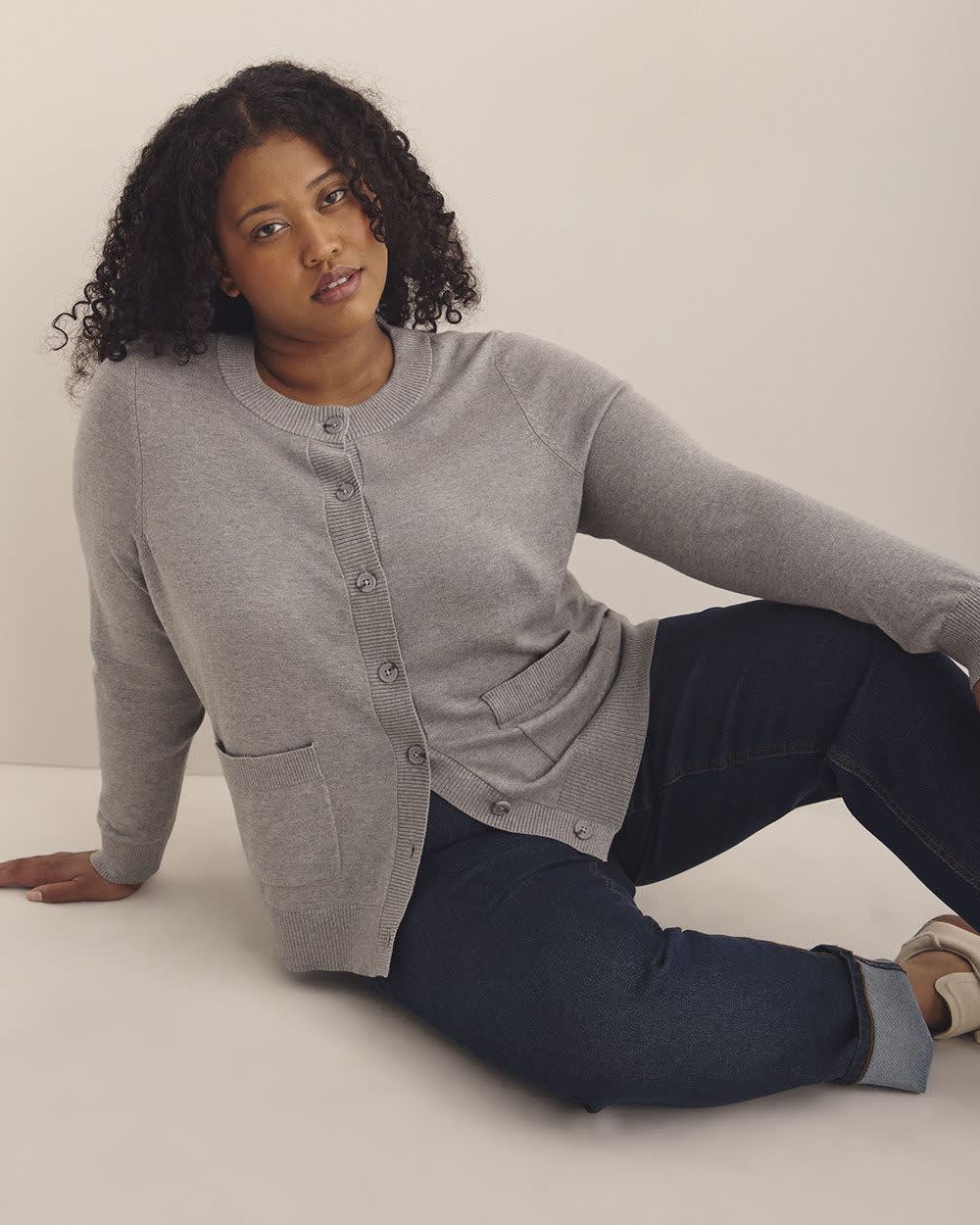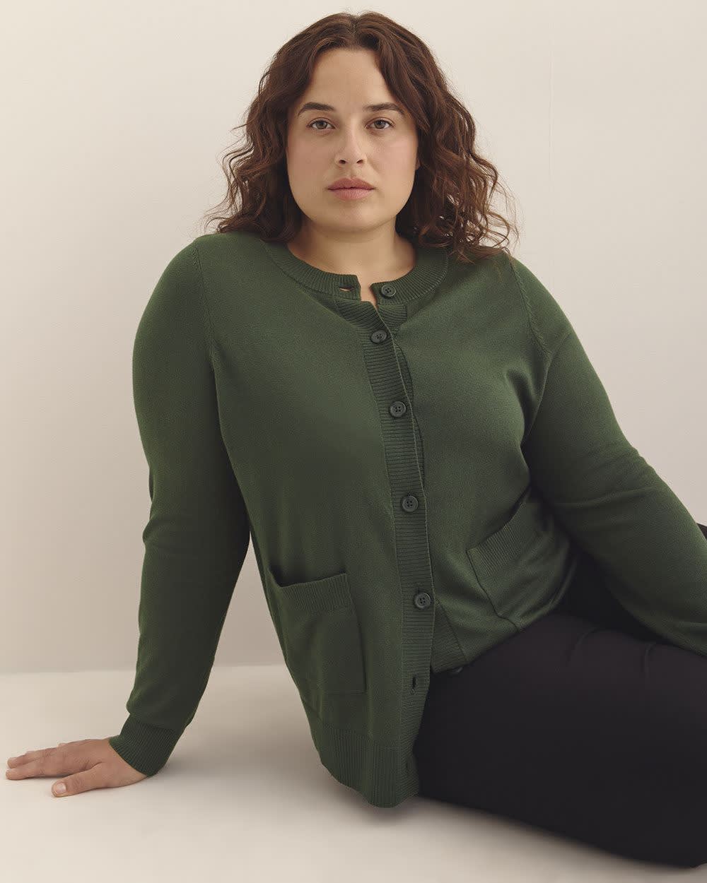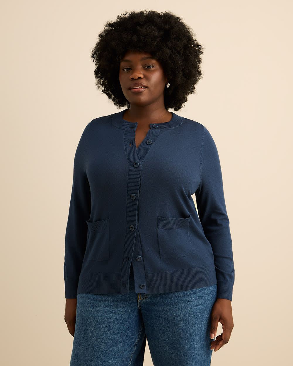 Aussi stylé que confortable, ce cardigan taille plus douillet est parfait à porter au bureau comme à la maison grâce à son style classique à devant boutonné, à col rond et à détails côtelés.