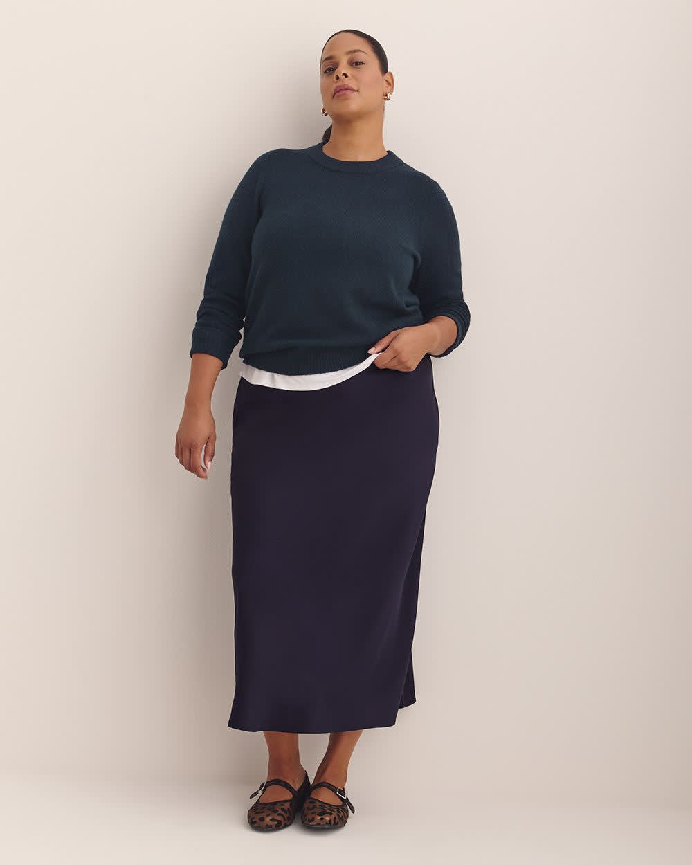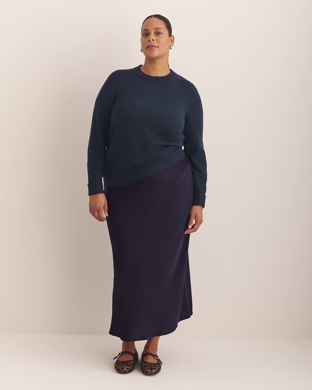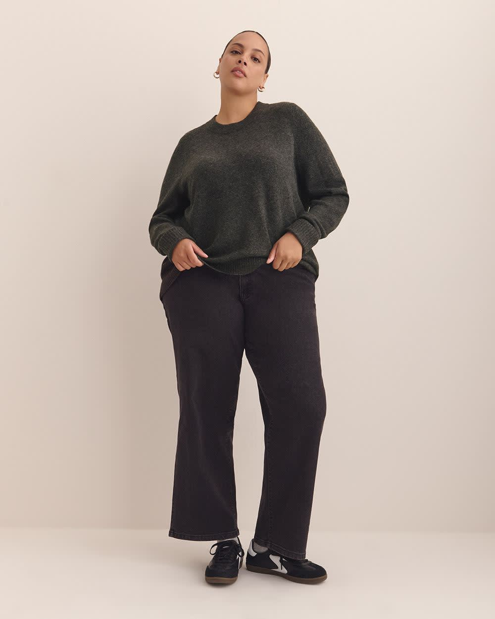 Brillez sans effort avec ce chandail à col rond scintillant taille plus. Son fini à mailles métalliques, sa couleur chinée, sa coupe décontractée et son ourlet asymétrique ajoutent une touche d'éclat à votre style quotidien.