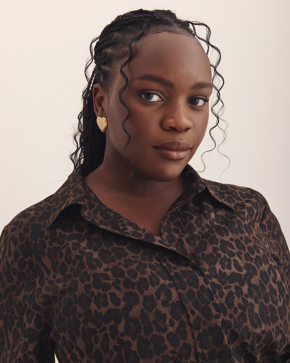 Alliez style et fonctionnalité avec cette robe utilitaire taille plus. Faite d'un fini en twill tendance à motif léopard, d'un col chemise et d'une silhouette trapèze, elle sublime votre silhouette tout en offrant une allure soignée et décontractée. Les détails tels que la ceinture à nouer et les poches sur les côtés ajoutent une touche utilitaire chic, idéale pour une tenue polyvalente.