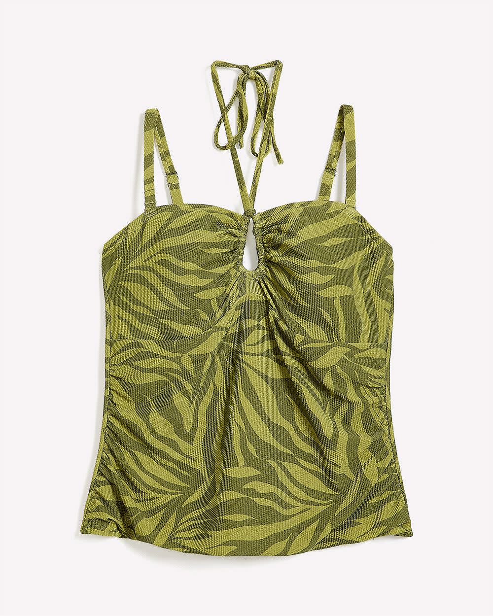 Haut tankini vert froncé style bandeau à motif de feuillage