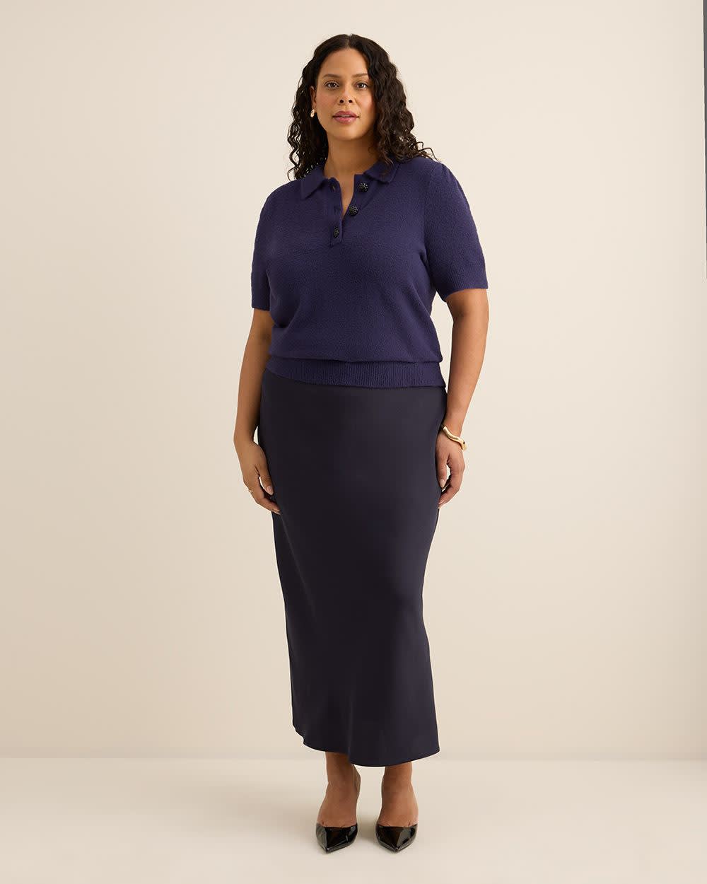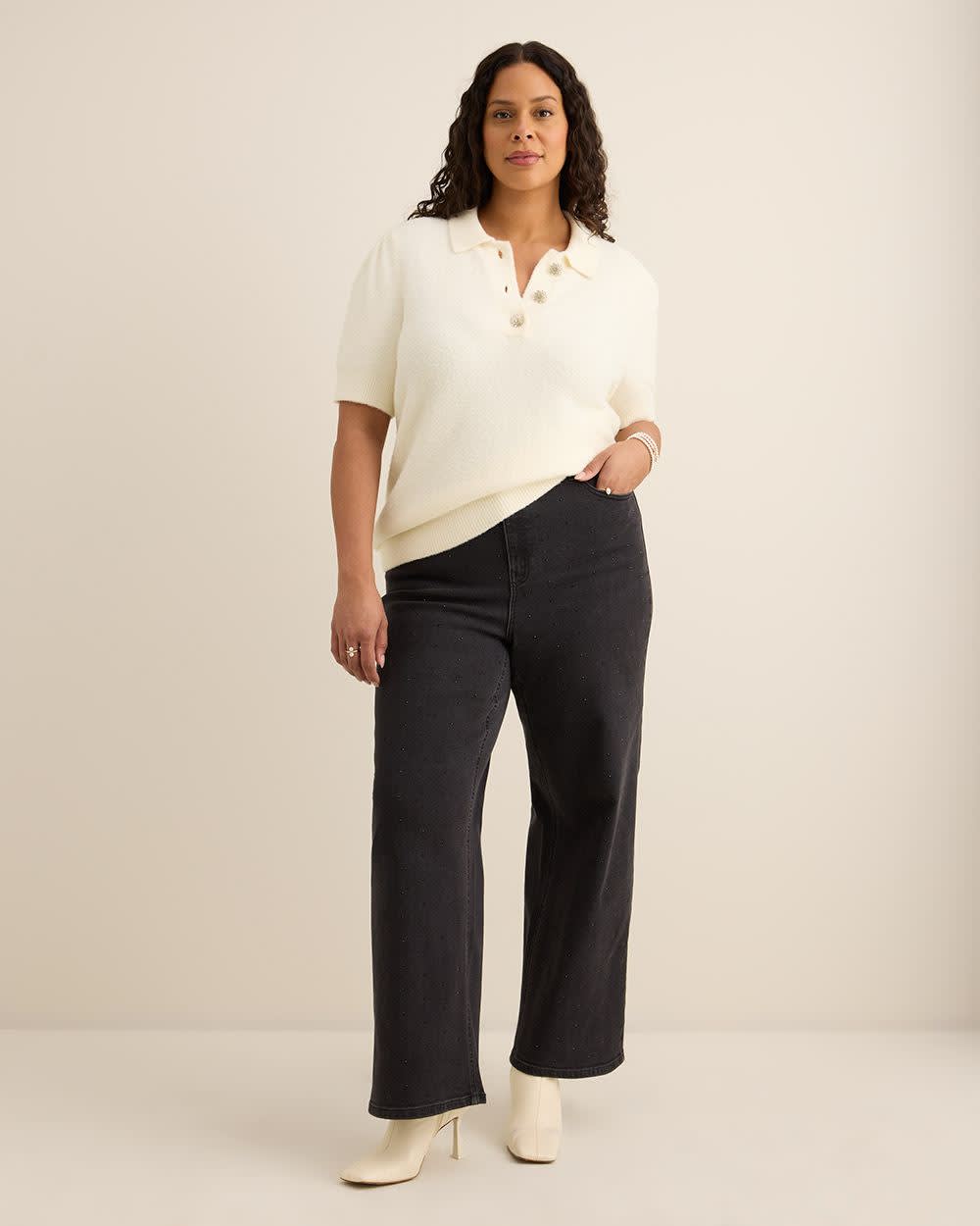 Doux et raffiné, ce chandail polo taille plus en tricot duveteux apporte une touche de luxe à votre style quotidien. Avec ses boutons décoratifs, son fini poilu et ses manches courtes, ce pull allie confort et élégance.
