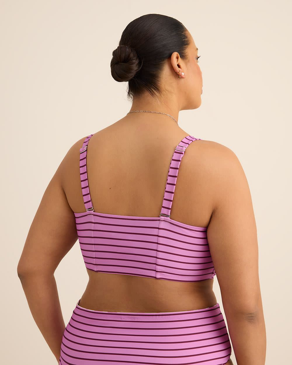 Un parfait mélange de style et de soutien pour vous permettre de profiter pleinement de vos vacances au soleil! Ce haut de bikini rayé taille plus avec armatures vous offre un confort raffiné. Doté d'un design croisé moderne, ce haut de maillot vous assure un ajustement parfait grâce à ses bretelles interchangeables et réglables.