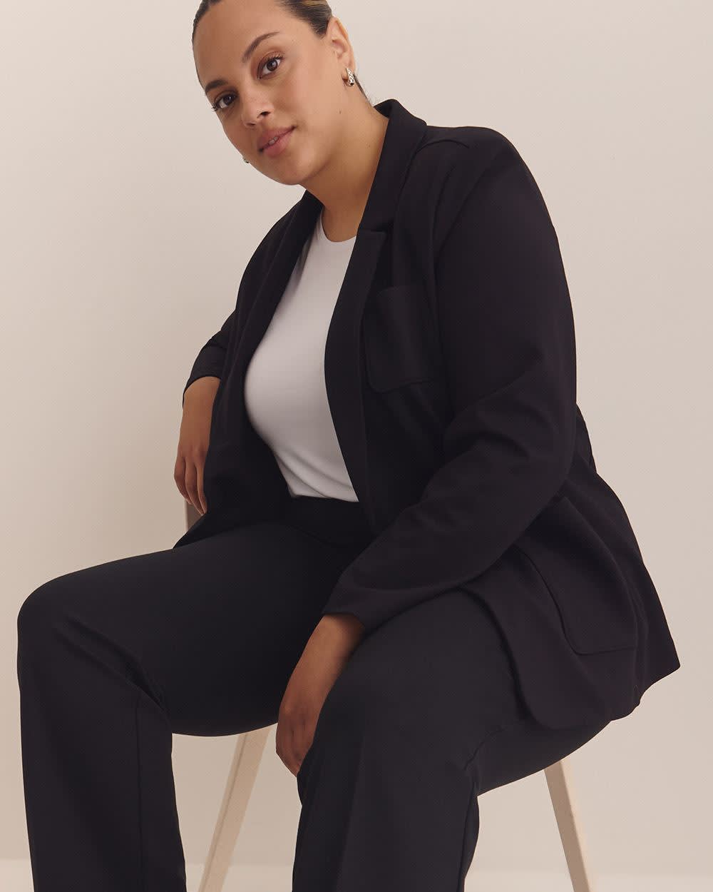 Pour une tenue aussi simple qu'élégante et confortable, essayez ce magnifique pantalon amincissant taille plus, fait de pointe de Rome tout en douceur. Avec sa jambe droite longueur petite et sa couleur noire passe-partout, il se porte autant lors d'une journée au bureau qu'un événement plus décontracté. Caractéristiques - Fini en pointe de Rome - Couleur unie - Style essentiel à  enfiler - Jambe droite - Maintien amincissant des hanches et des fesses - Bande de taille élastique - Panneau en maille intégré 360 - Effet amincissant et sculptant - Longueur petite - Entrejambe : 28 po