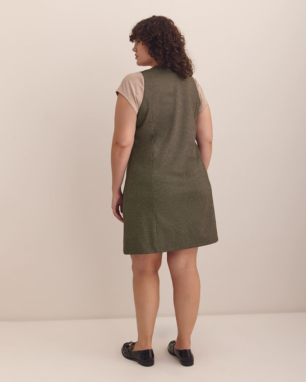 Alliez chic et originalité avec cette robe tablier taille plus à  motif pied-de-poule. Son encolure en V, son devant boutonné et sa coupe évasée en font une pièce intemporelle à  porter seule ou superposée sur un col roulé pour plus de style. Caractéristiques - Fini en tricot pied-de-poule - Sans manches - Encolure en V - Devant boutonné - Style tablier - Coupe trapèze - Longueur : courte