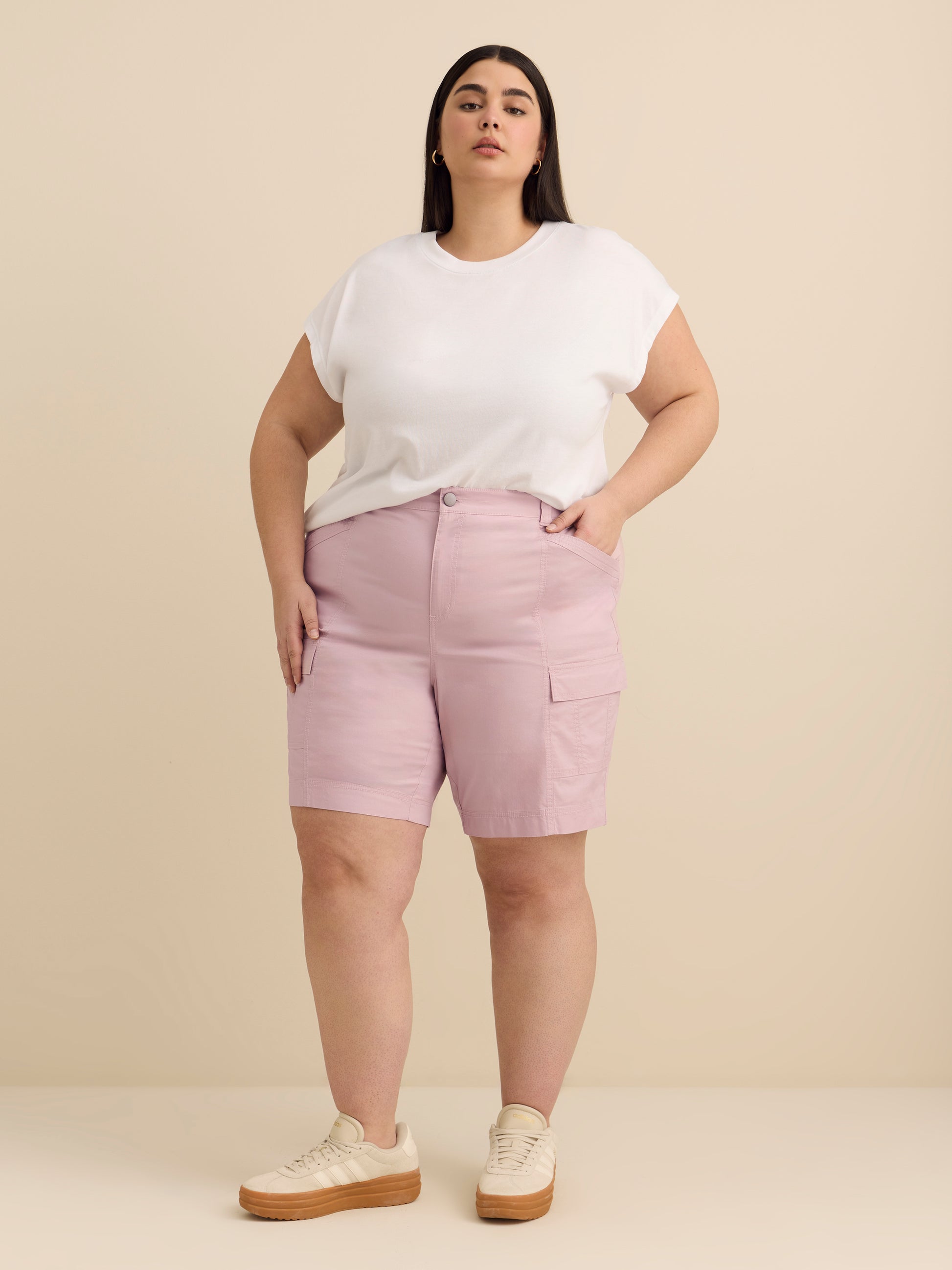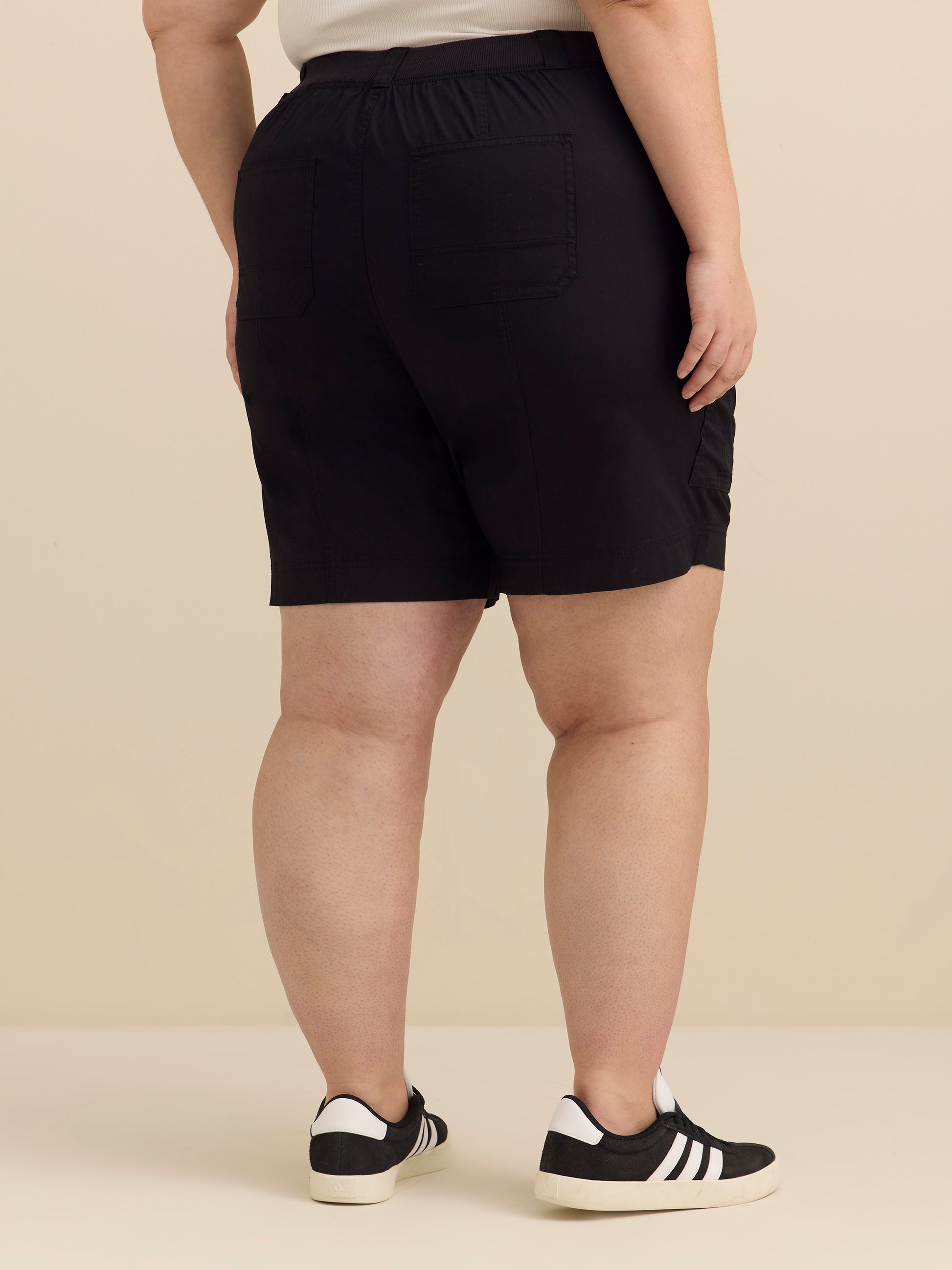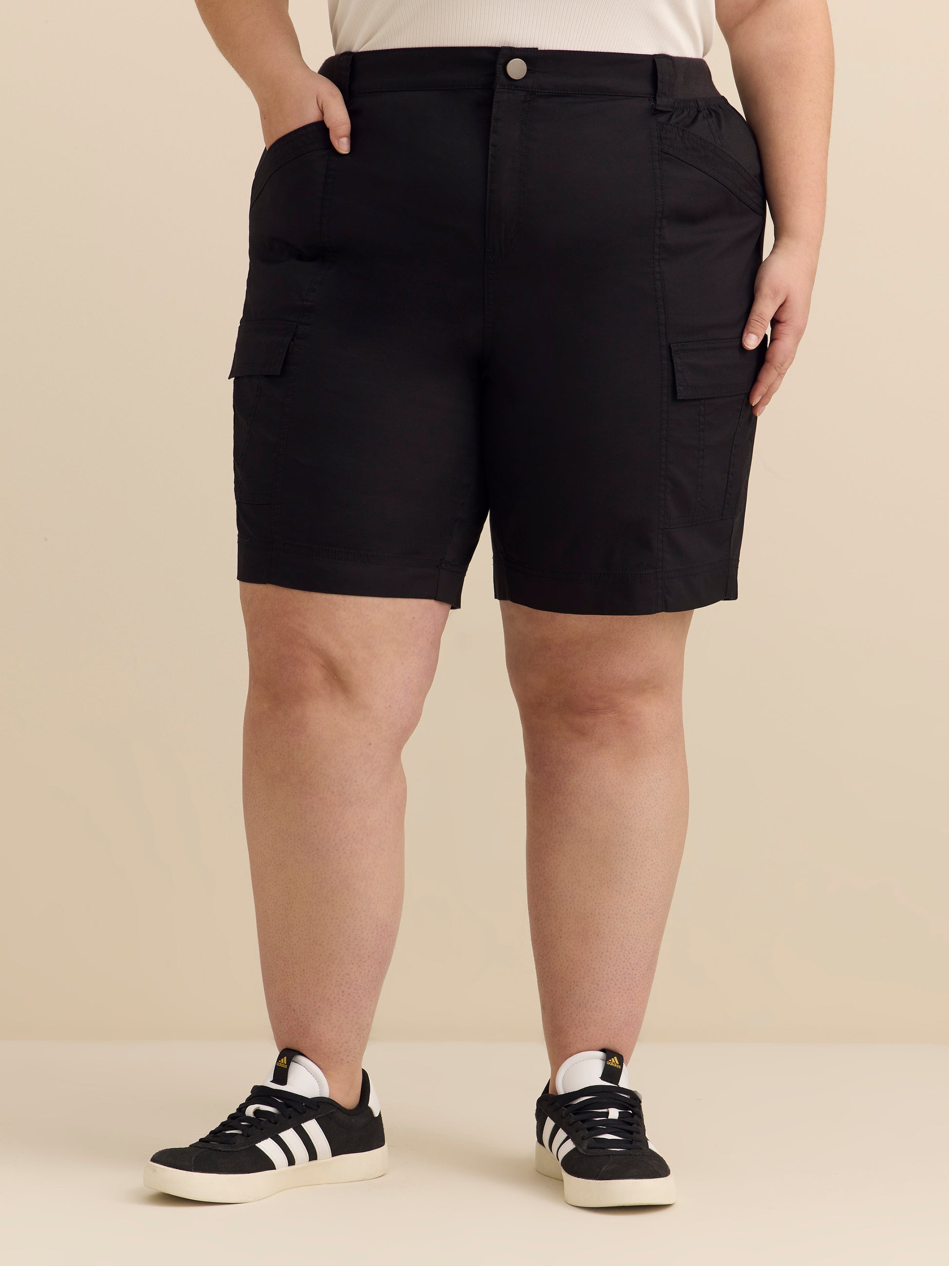 Ce bermuda taille plus offre un confort décontracté et pratique. Doté d'une taille côtelée à l'arrière, de poches cargo fonctionnelles et de passants de ceinture classiques, il se porte aisément au quotidien.