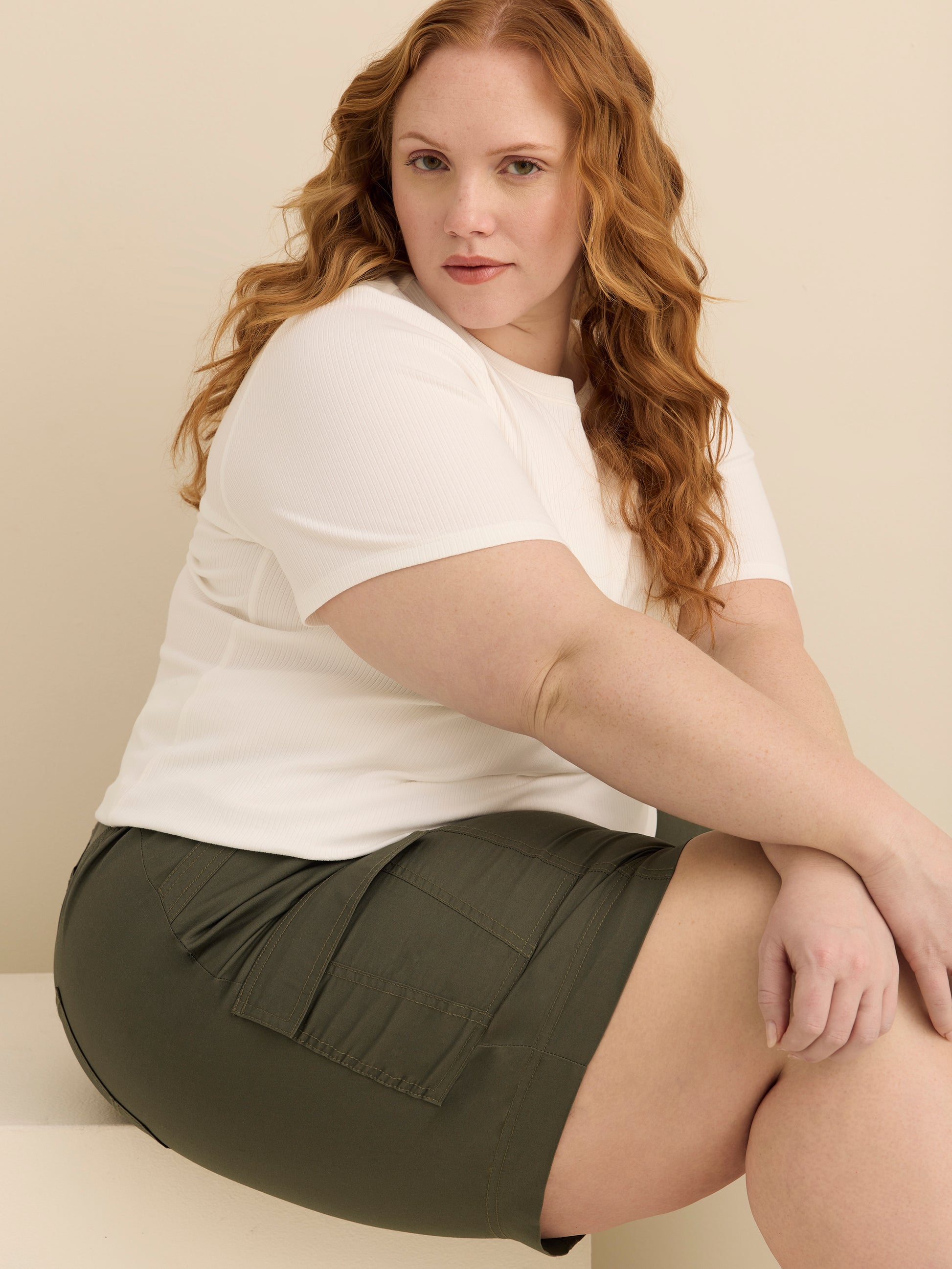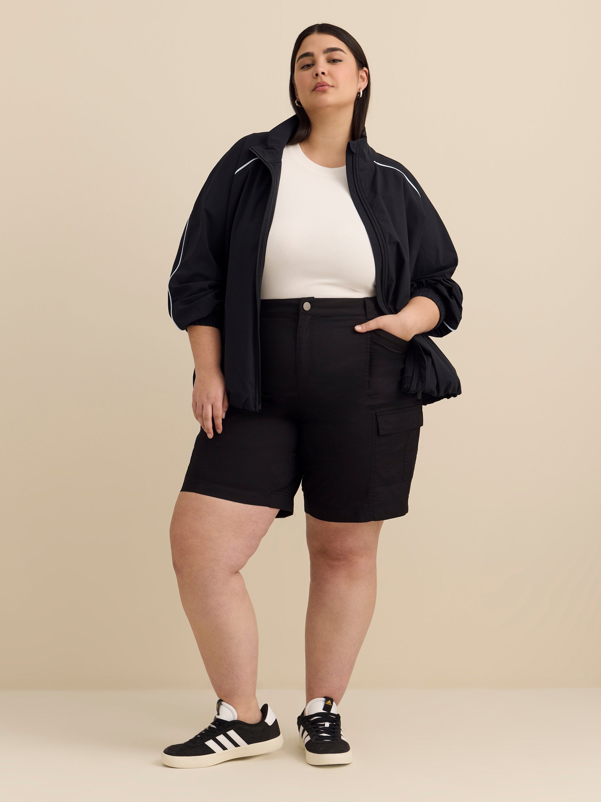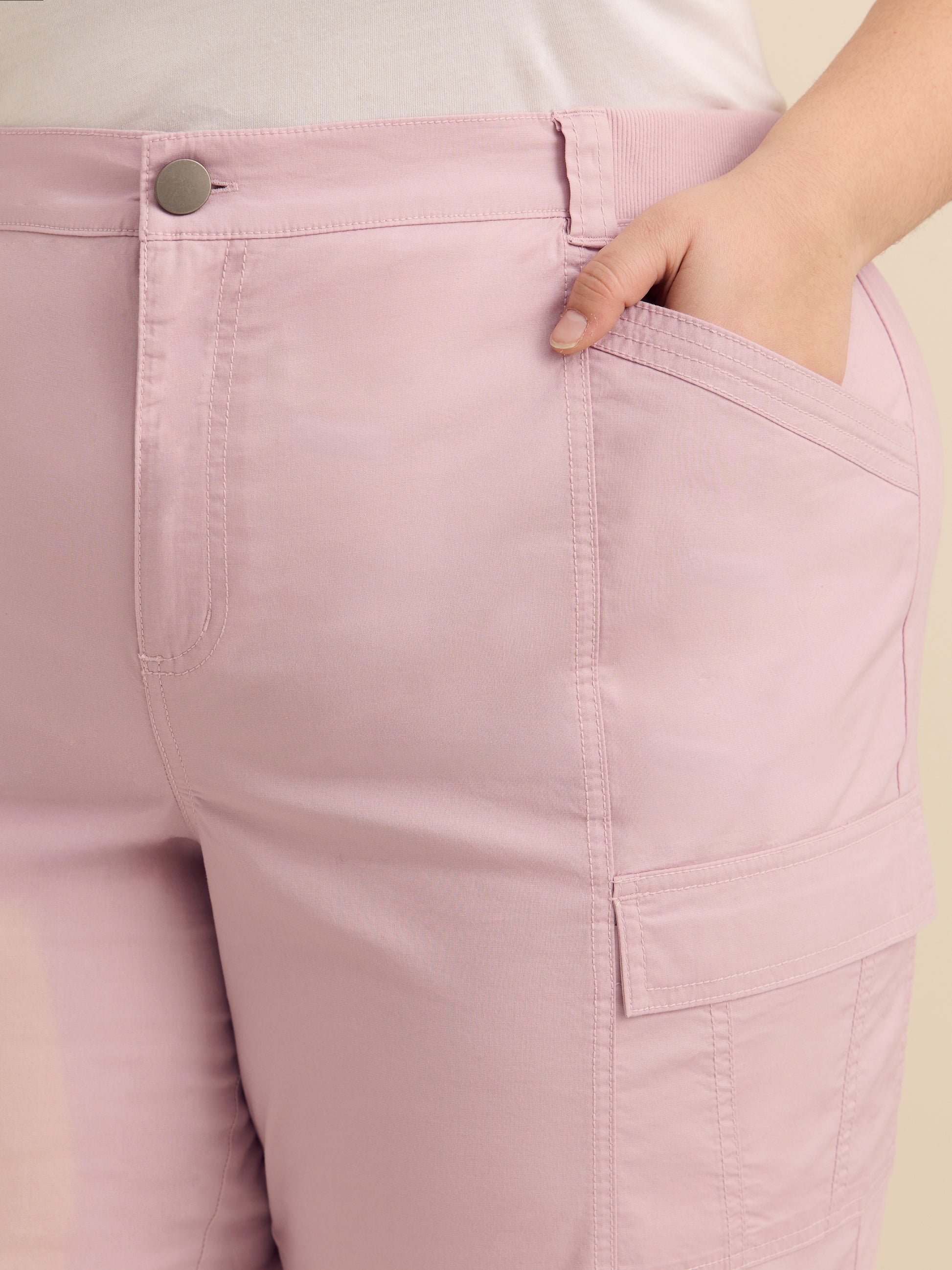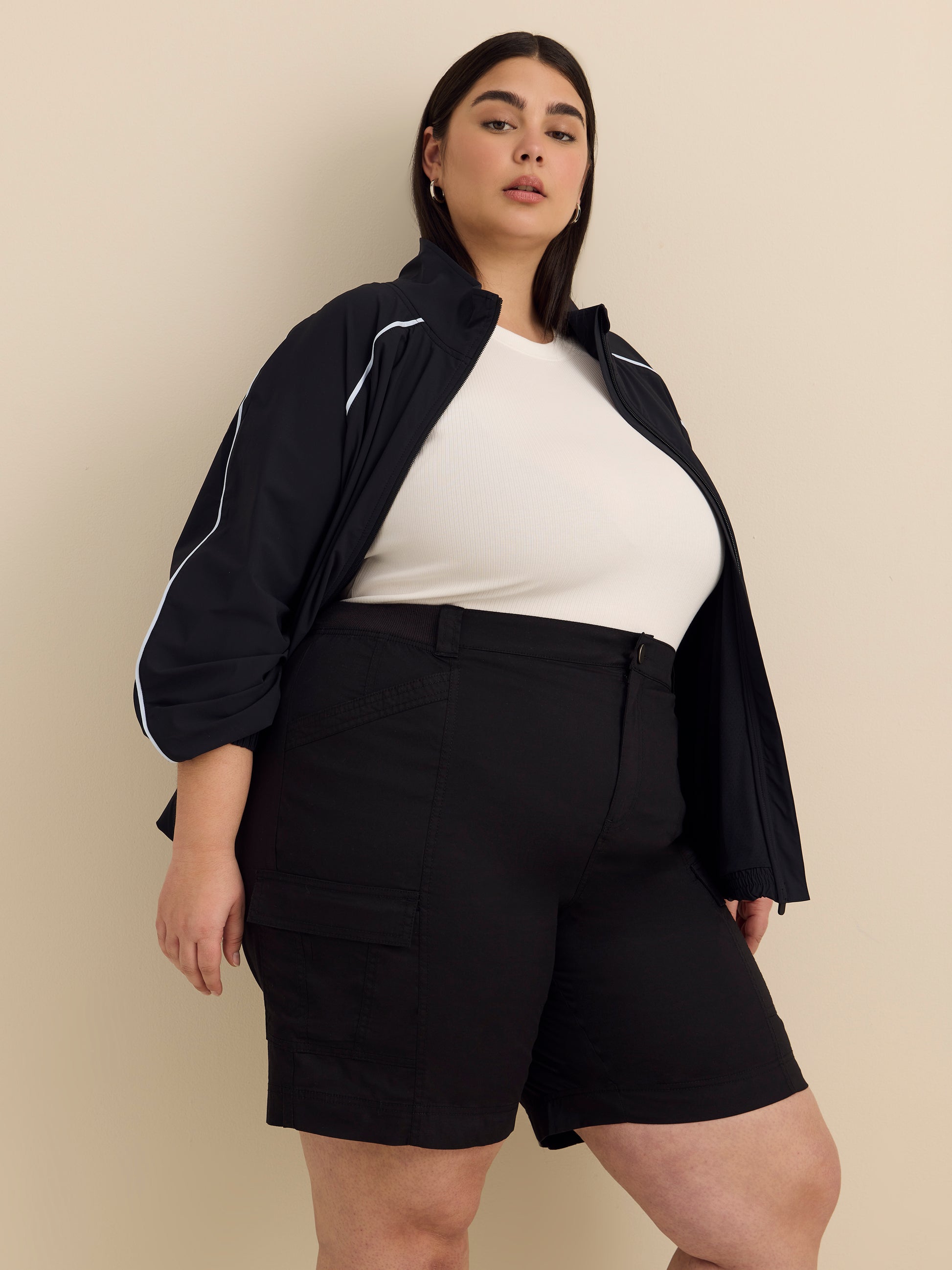 Ce bermuda taille plus offre un confort décontracté et pratique. Doté d'une taille côtelée à l'arrière, de poches cargo fonctionnelles et de passants de ceinture classiques, il se porte aisément au quotidien.