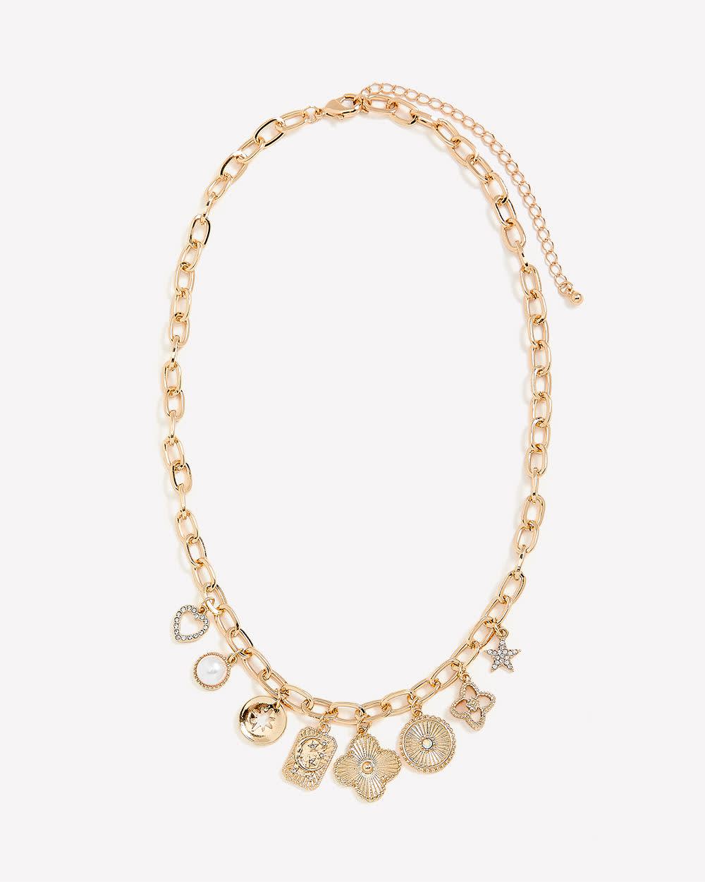 Affirmez votre style avec ce collier à maillons dorés agrémenté de breloques. Court et polyvalent, il apporte éclat et caractère à toutes vos tenues.