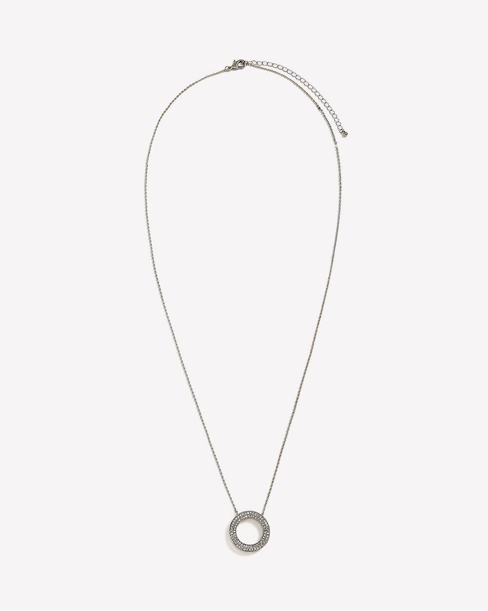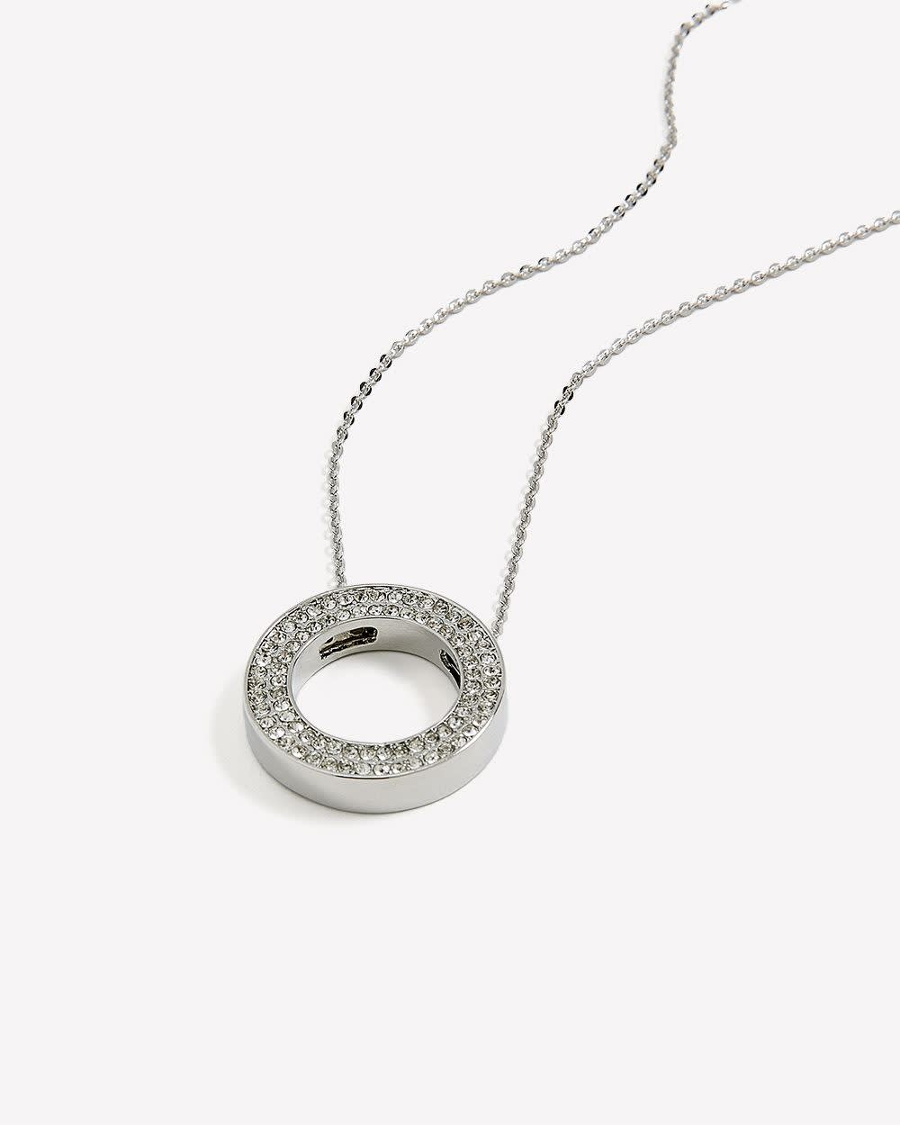 Brillez avec élégance grâce à ce long collier argenté orné d'un pendentif circulaire en strass. Chic et polyvalent, il complète à merveille toutes vos tenues.