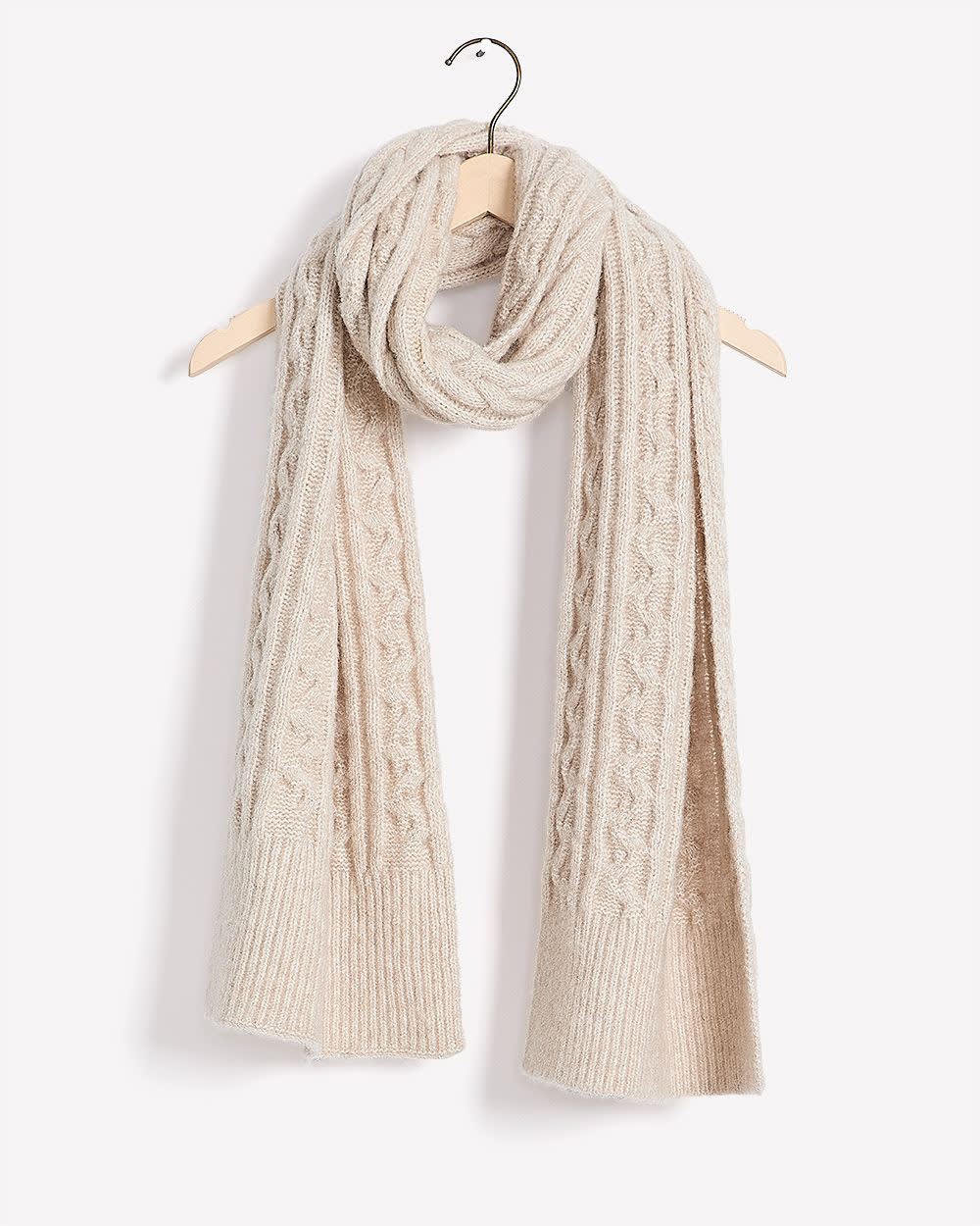 Enveloppez-vous dans un style douillet et confortable! L'accessoire parfait pour protéger votre cou des intémpéries des saisons froides, cette écharpe est faite d'un tricot à mailles torsadées avec une bande côtelé à ses extrémités pour vous offrir un look classique et tendance.