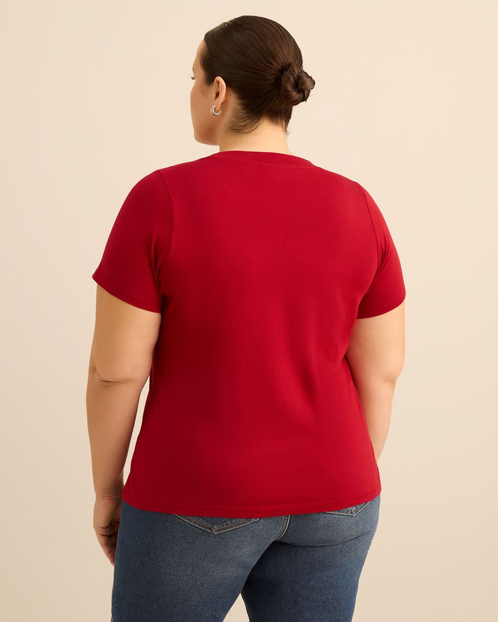 EXCLUSIVITÉ EN LIGNE. Diffusez de l'amour à profusion avec ce haut taille plus en jersey doux orné d'un imprimé sur la poitrine. Sa coupe droite et son col rond classique en font une pièce confortable et pleine de positivité.