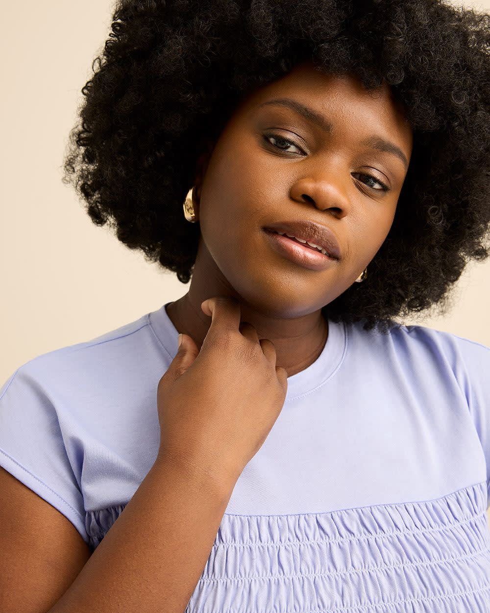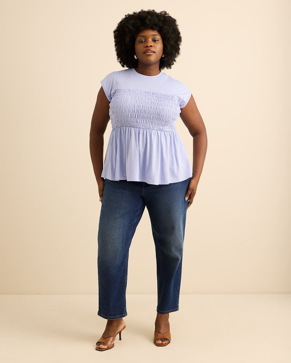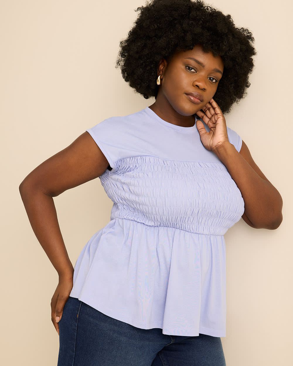 Classique et minimaliste,ce haut taille plus en tricot extensible combine un corps smocké élégant avec des manches prolongées pour une élégance moderne.Sa coupe ajustée et évasée allie parfaitement confort et polyvalence.