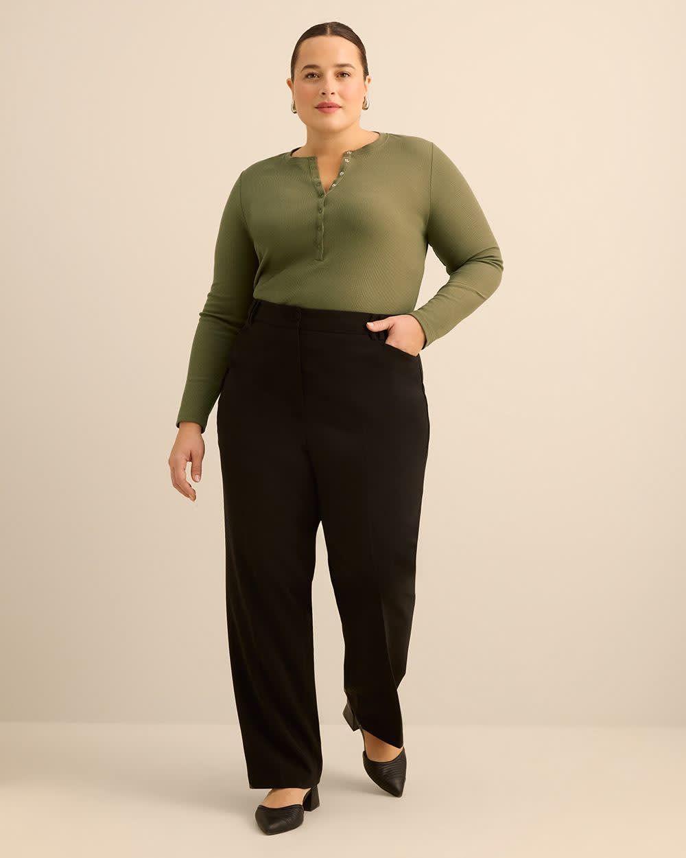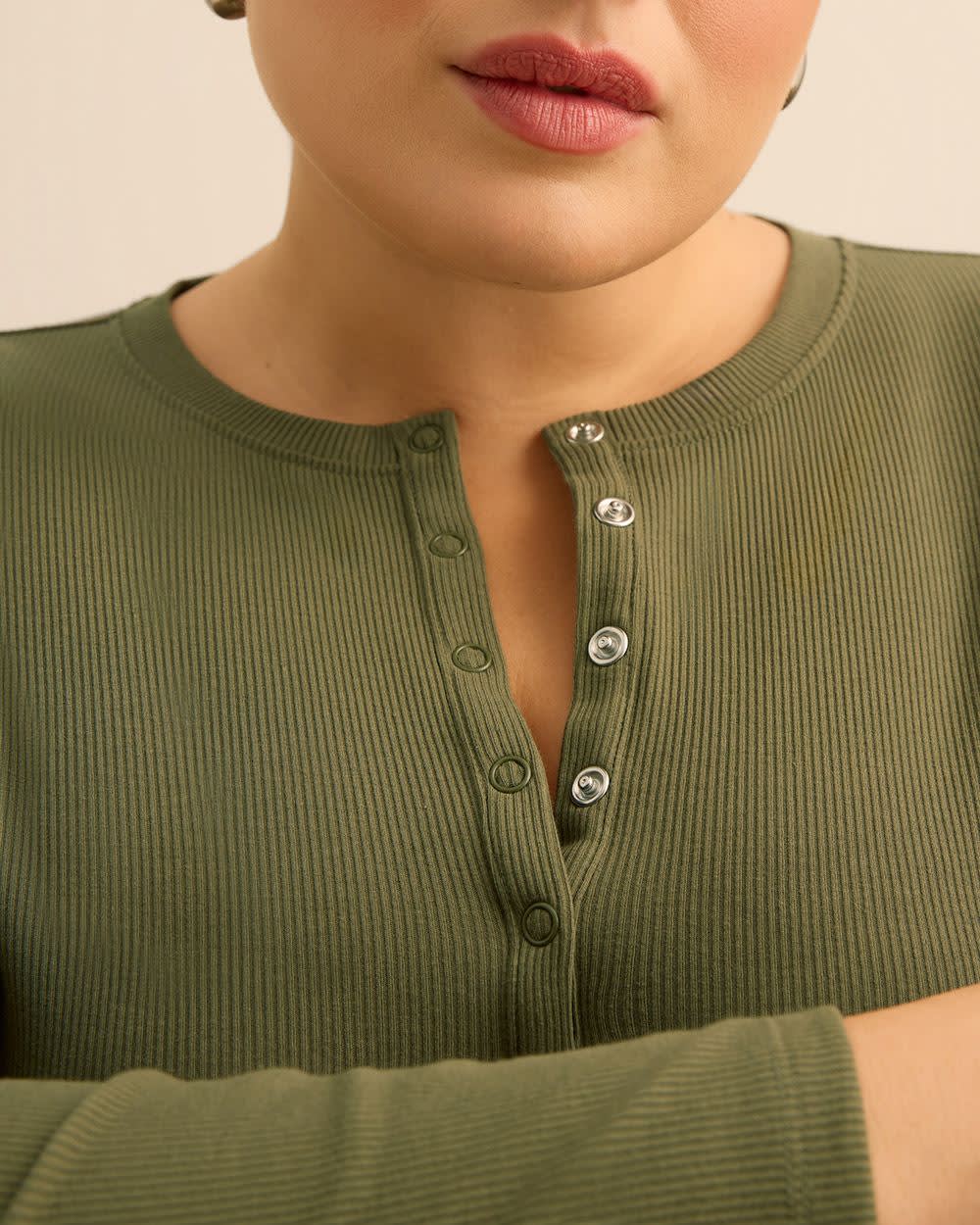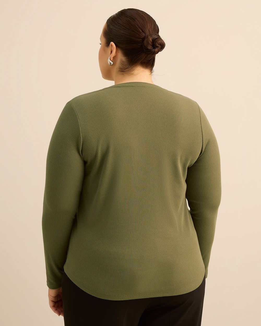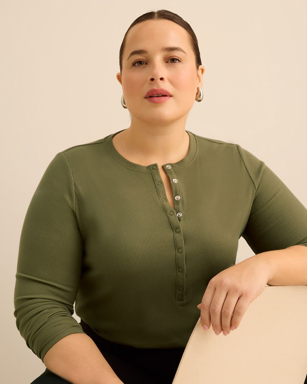 Pourquoi réinventer un classique? Ce chandail taille plus en tricot côtelé à manches longues est un indispensable tout au long de l'année. Dès que vous cherchez un haut confortable à porter, que vous restiez à la maison ou que vous vous déplaciez au bureau, ce haut à col Henley s'adapte autant à vos looks décontractés ou plus formels.