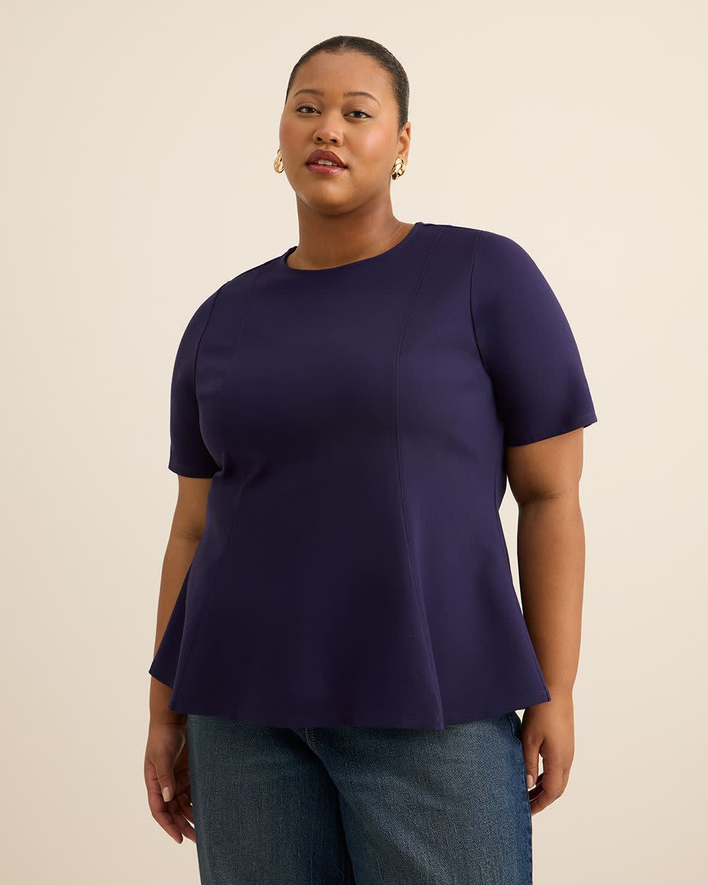 Mettez votre silhouette en valeur avec ce haut à manches courtes taille plus à coupe évasée. Confectionné en doux tricot Ponte de Roma avec des coutures décoratives, il allie confort structuré et élégance féminine.