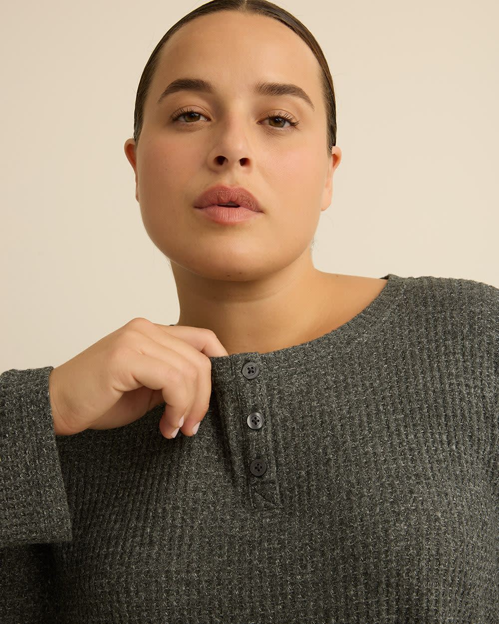 Détendez-vous avec style grâce à ce haut de pyjama court taille plus à manches longues fait de tricot gaufré. Son encolure boutonnée et sa coupe décontractée en font le pyjama idéal pour relaxer tout en confort.