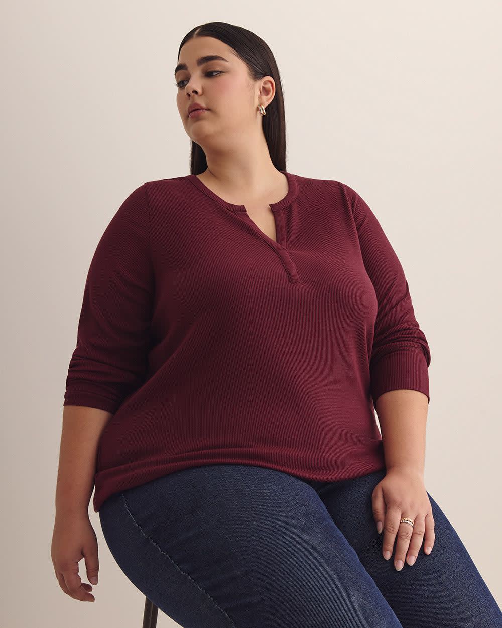 Ce haut taille plus décontracté est tout ce qu'il y a de plus polyvalent et confortable pour votre garde-robe automnale. À agencer avec tous vos morceaux favoris, des jeans aux leggings grâce à son fini gaufré et à son col en V fendu!