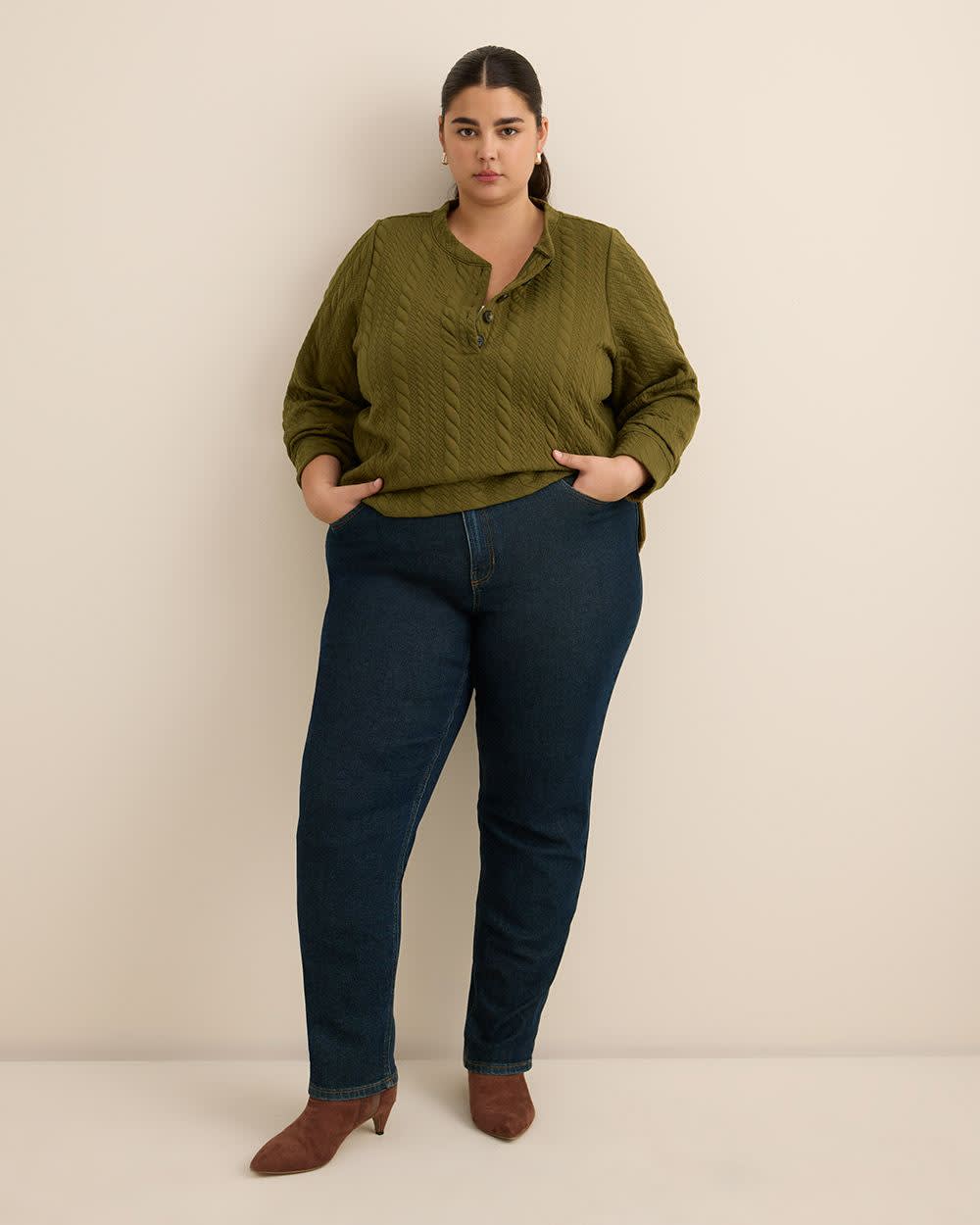 Restez au chaud avec style grâce à ce chandail à col rond taille plus en tricot torsadé. Sa texture douce et sa patte de boutonnage ajoutent une touche de charme intemporel aux journées plus fraîches.