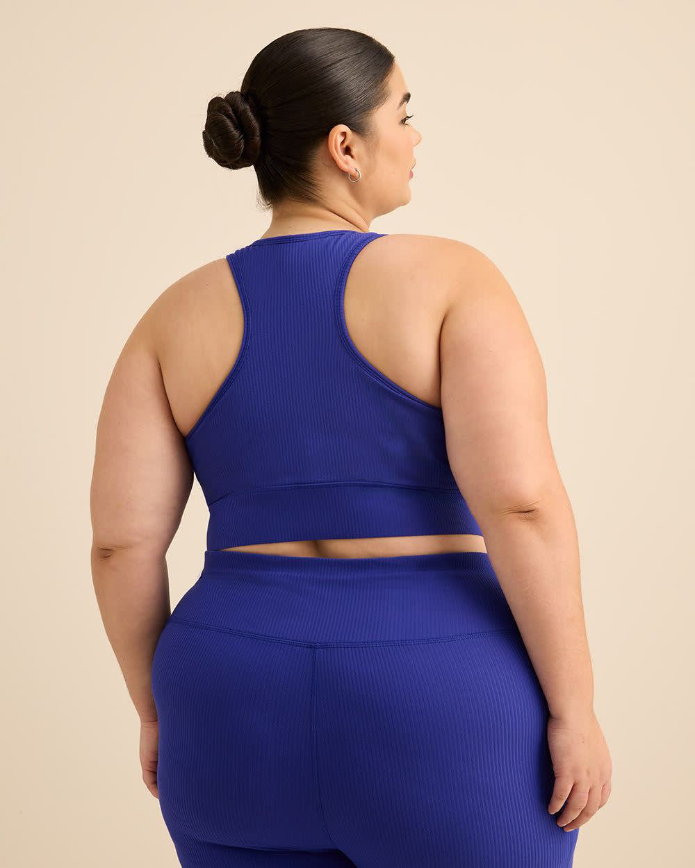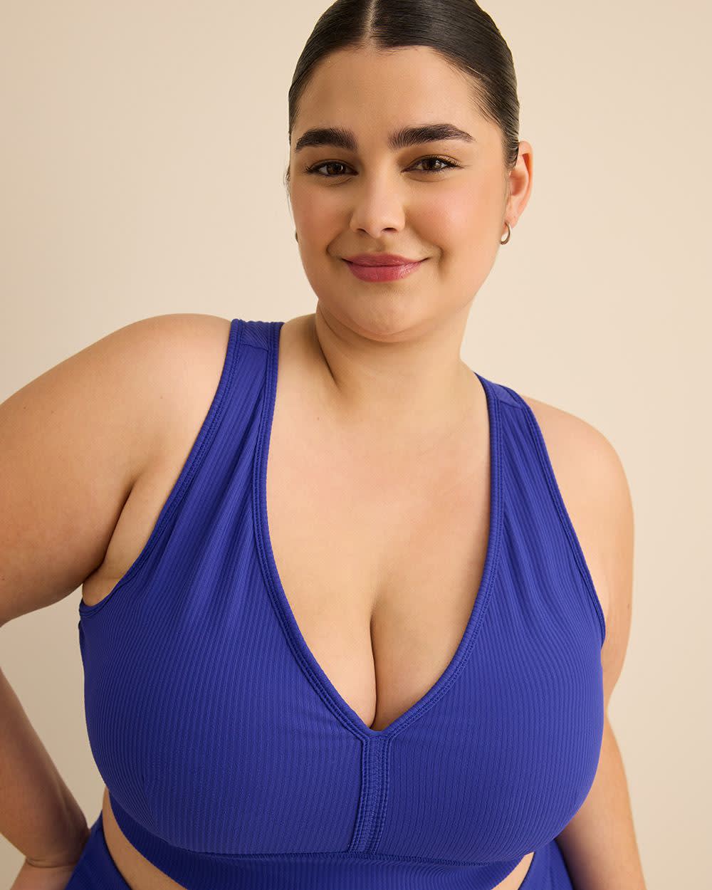 EXCLUSIVITÉ EN LIGNE. Doux, élégant et structuré - ce haut court taille plus en tricot côtelé à col en V deviendra vite un essentiel. Avec ses bonnets amovibles, son style sans manches et son dos nageur, il allie confort et allure sportive flatteuse.