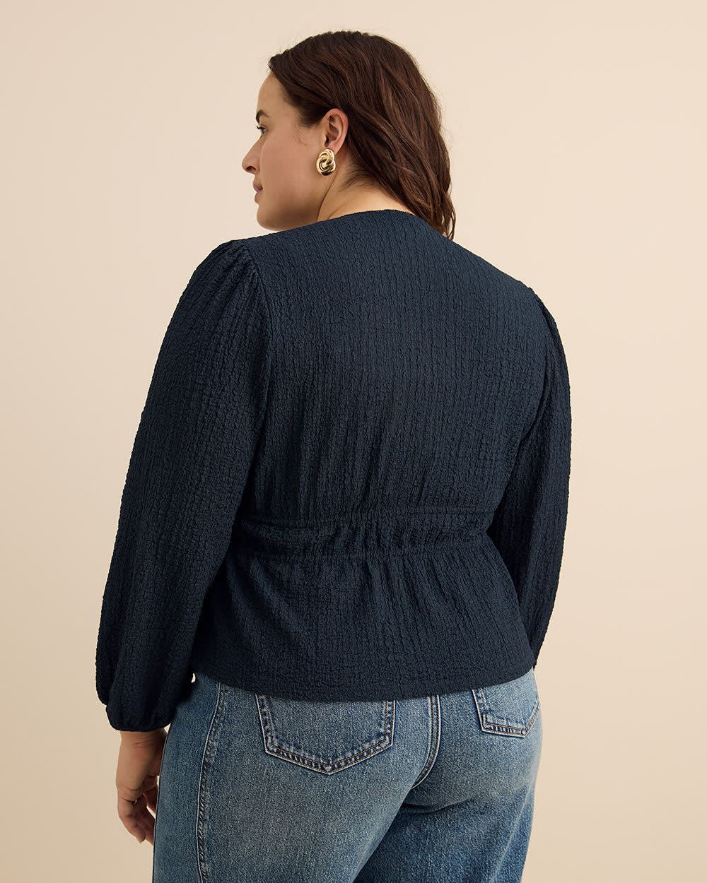 Un fini texturé, un look léger avec cordon à nouer, et des manches longues bouffantes ultra féminines. Voilà une combinaison parfaite pour un look réussi! Ce haut taille plus est parfait à porter pour un style parfaitement tendance.