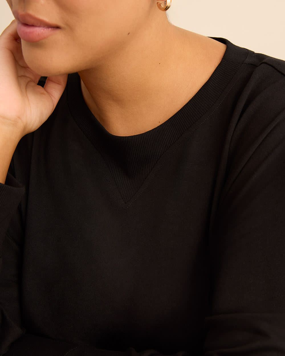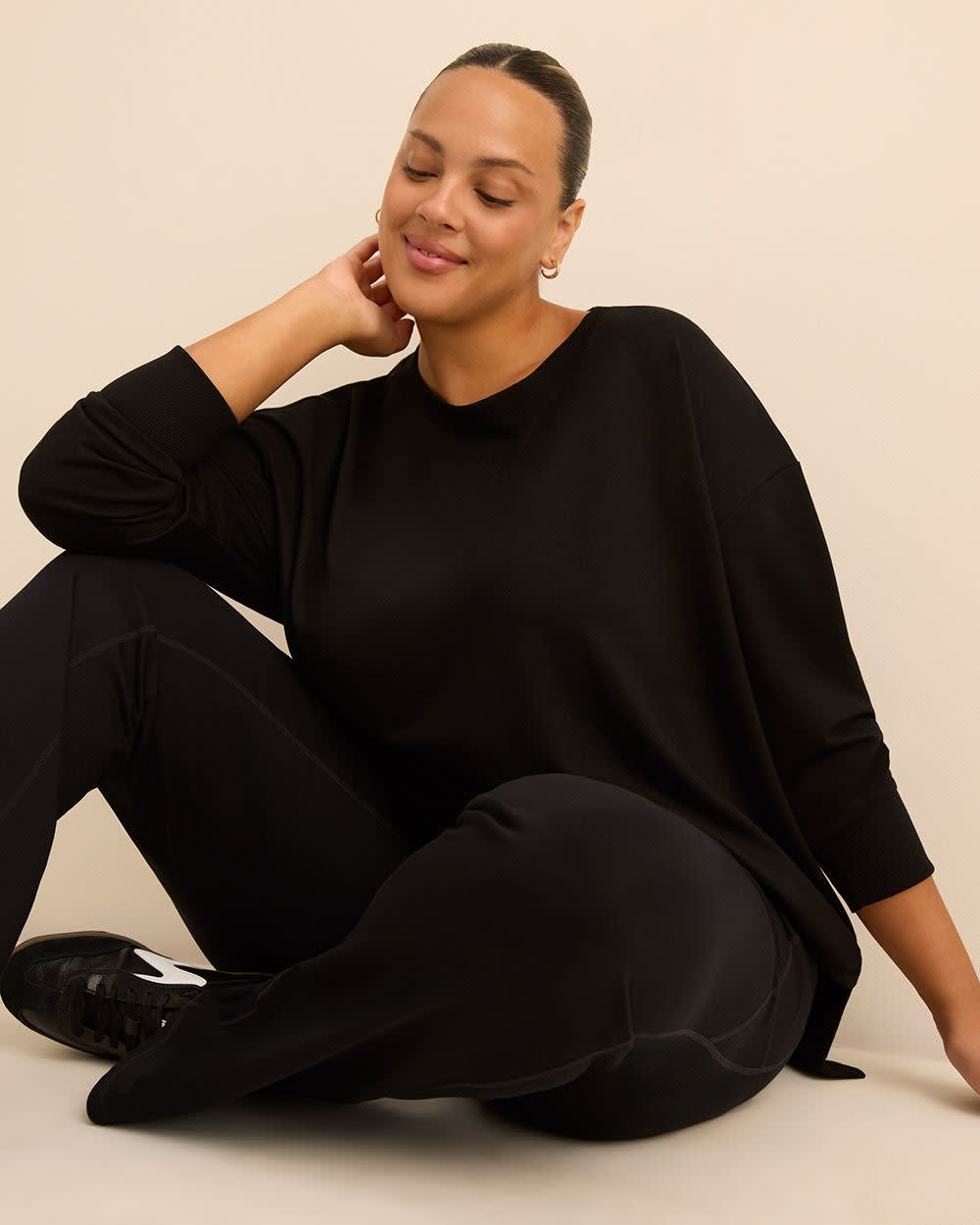 C'est la saison des hauts confos! Ce haut taille plus à manches longues est un essentiel assuré pour un parfait mélange de confort et de style, grâce à son fini en tricot français et ses détails côtelés. Bref, c'est le haut parfait pour relaxer à la maison ou quitter le gym avec style après une séance de cardio intense.