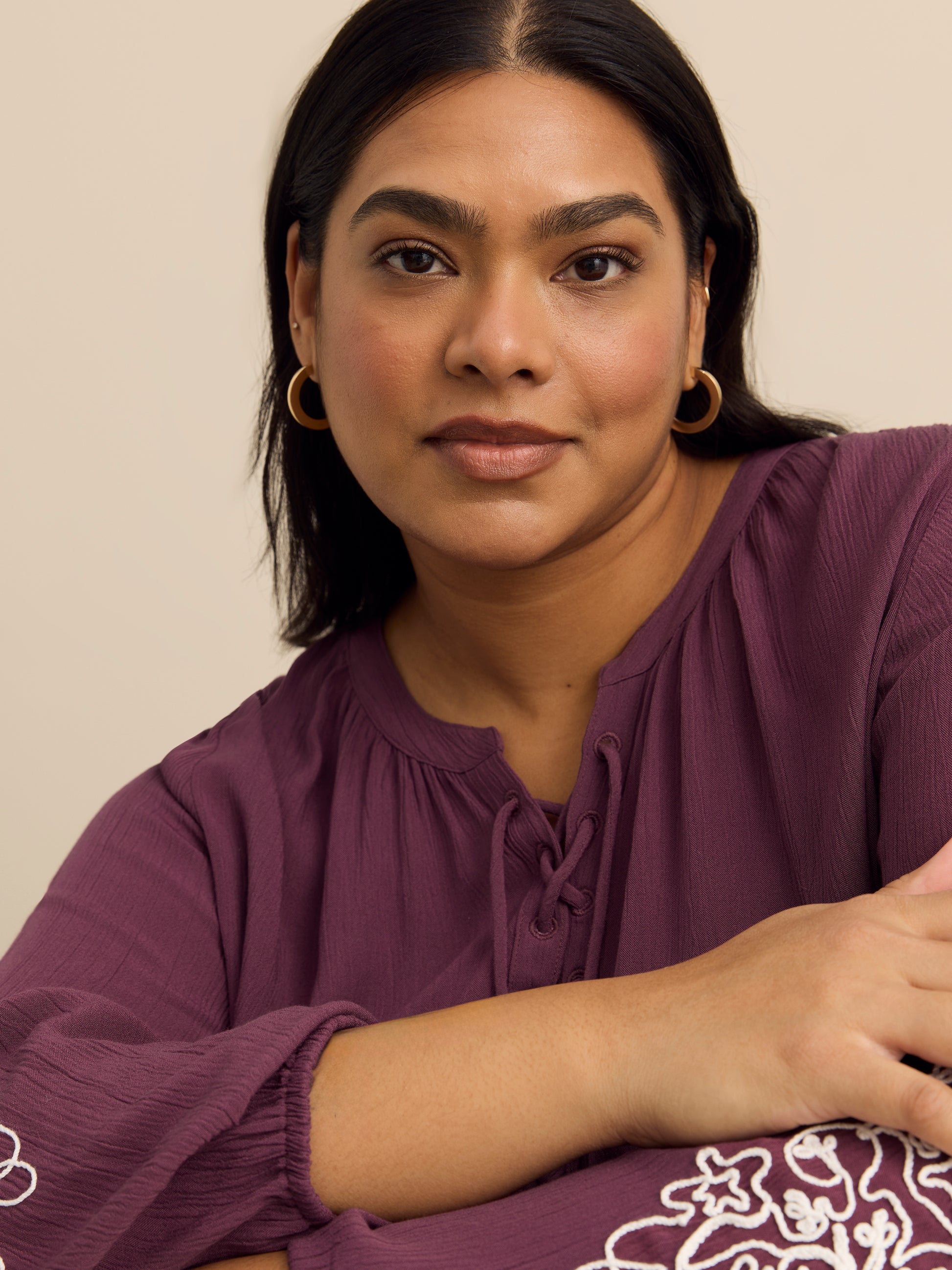 Légère, fluide et délicieusement bohème. Cette blouse évasée taille plus séduit avec ses fronces délicates, ses cordons à pampilles et ses broderies sur les manches—idéale pour apporter charme et mouvement à votre style du quotidien.
