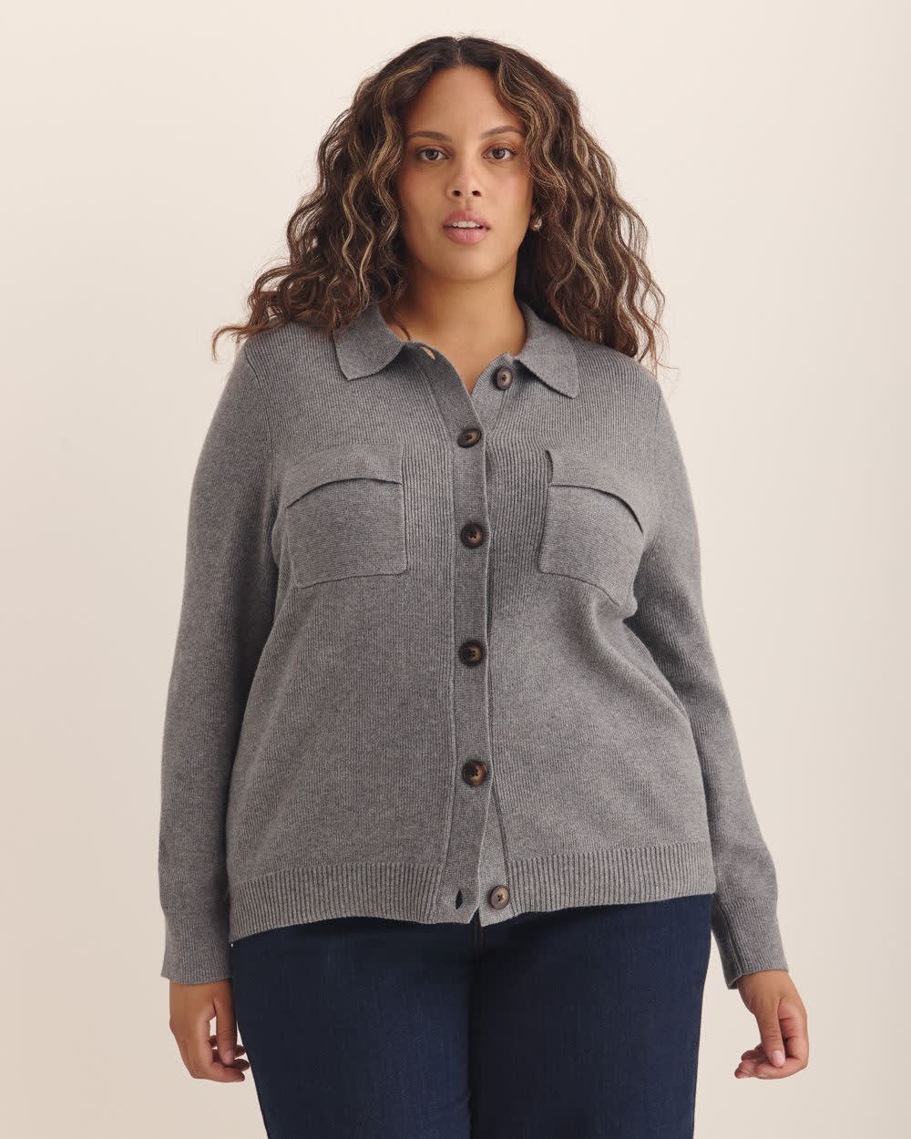 Lorsque deux classiques se rencontrent, vous obtenez ce cardigan taille plus au style d'un pull avec col polo. Conà§u dans un tissu en tricot ultra doux, ce pull boutonné est un choix tout confort pour une tenue aussi décontractée qu'élégante. Caractéristiques - Fini en tricot - Rayures sur l'ensemble - Col polo - Devant boutonné - Manches longues - Poches appliquées à  la poitrine - Coupe droite - Longueur : 26 po