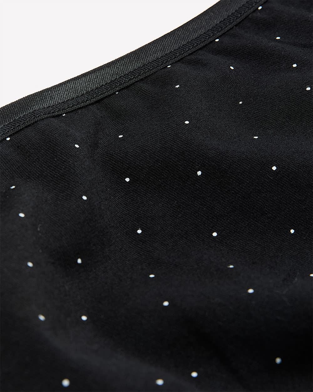 Féminine et passe-partout, cette jolie culotte échancrée noire taille plus vous assure un confort absolu tout au long de la journée grâce à son fini en mélange de coton extensible. Son imprimé à pois classique et son élastique scintillant à la taille ajoutent une touche festive.