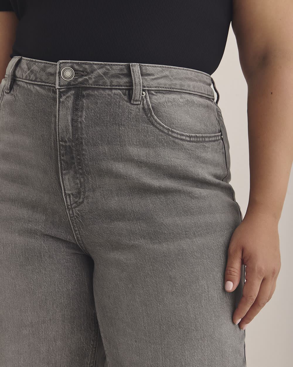 EXCLUSIVITÉ EN LIGNE. Un classique revisité avec style. Ce jean gris taille plus à taille haute présente une jambe large avec ourlet replié et une coupe classique à 5 poches. Idéal pour un look décontracté avec une touche de raffinement.