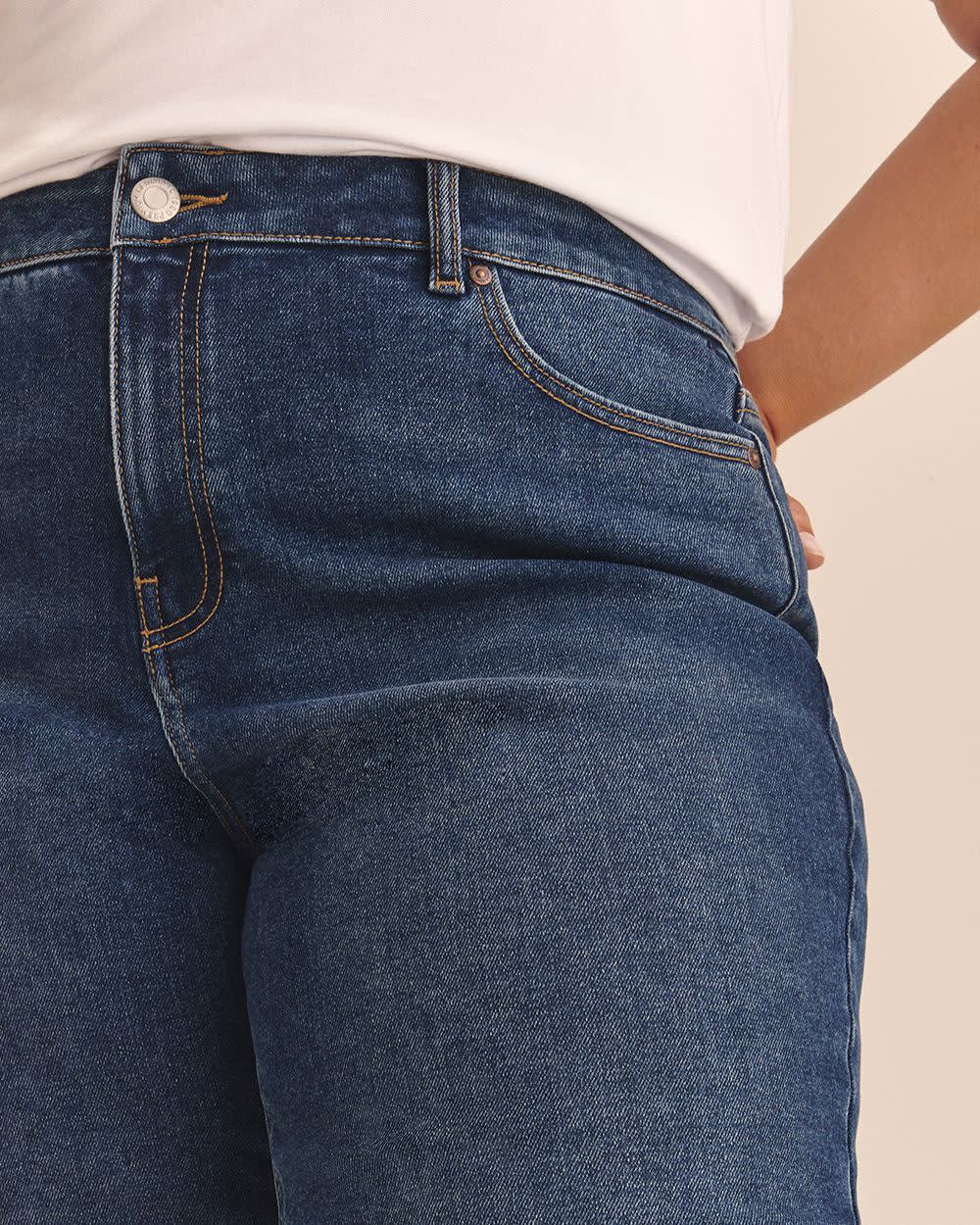"Un jean en denim extensible authentique dans une coupe rétro que toutes les mères adorent. Ce jean taille plus tendance style « mom » à délavé bleu arrive à la cheville pour un look polyvalent qui s'agence à tous les hauts, vestons ou blousons.