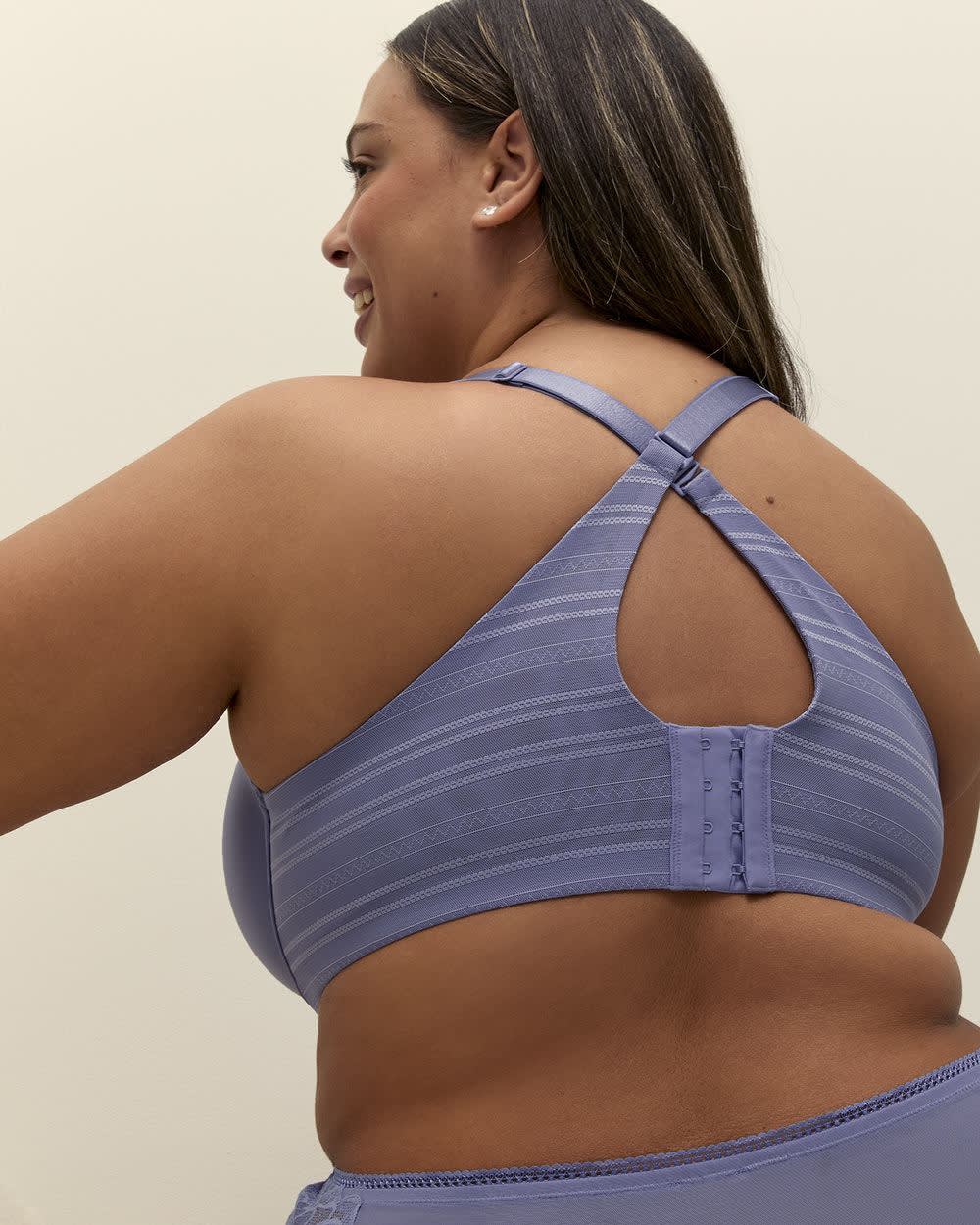 Un sublime décolleté pigeonnant, un support agréable et un confort rembourré. Ce soutien-gorge plongeant taille plus est fait de maille rayée lavande avec une encolure brodée, pour vous offrir un sous-vêtement aussi séduisant qu'agréable à porter.