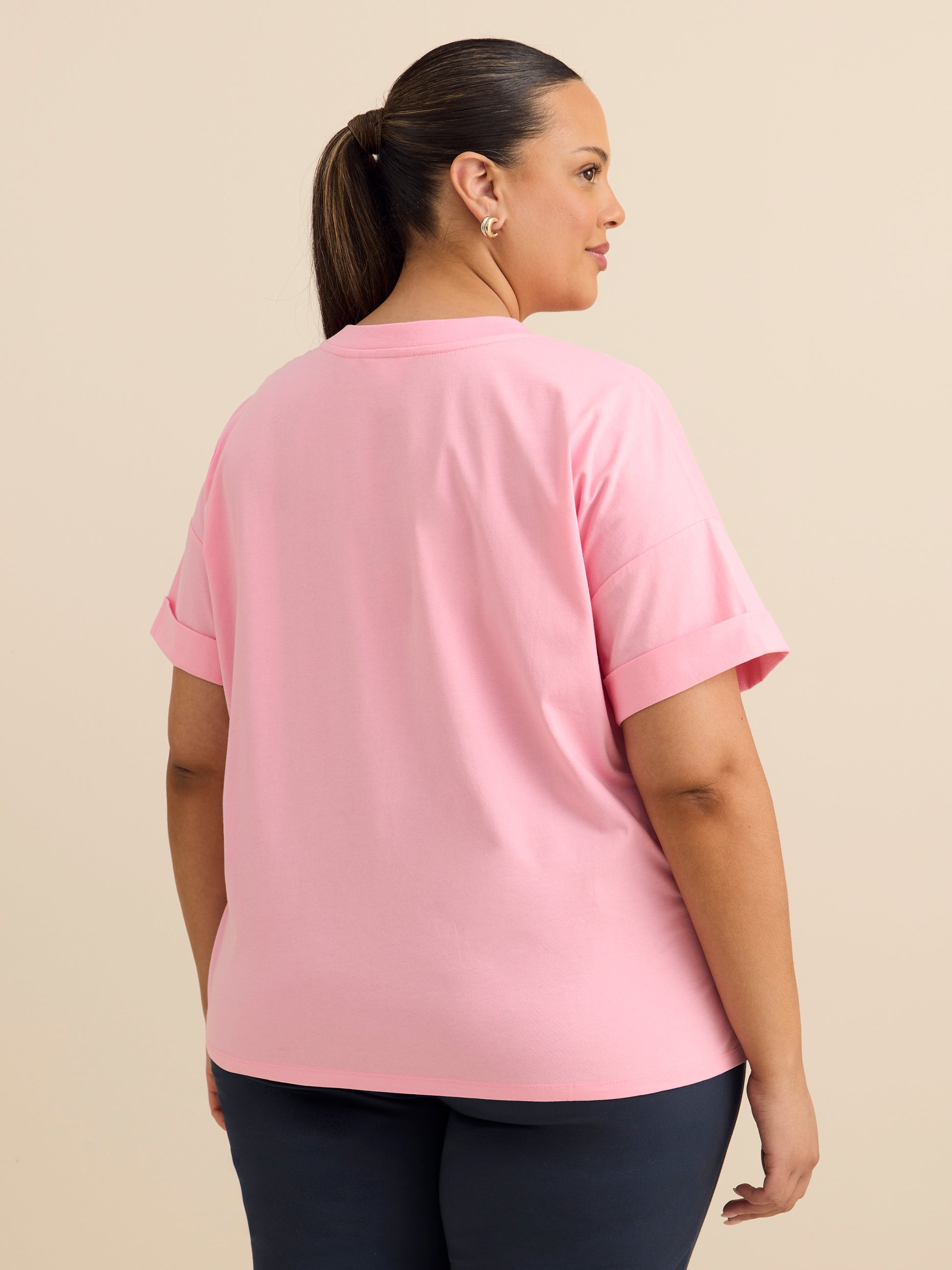 Quoi demander de plus qu'un t-shirt taille plus qui offre le parfait mélange de confort et de style? Avec sa coupe carrée moderne, ce haut deviendra assurément un essentiel de votre quotidien.