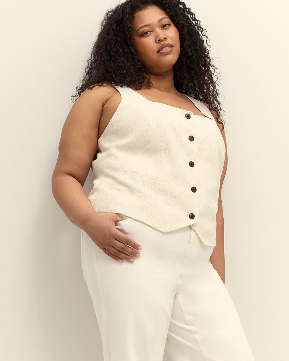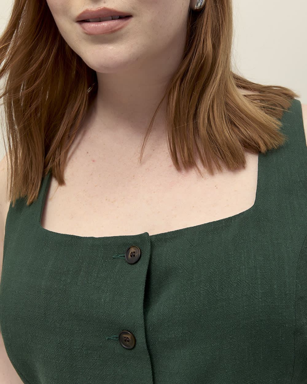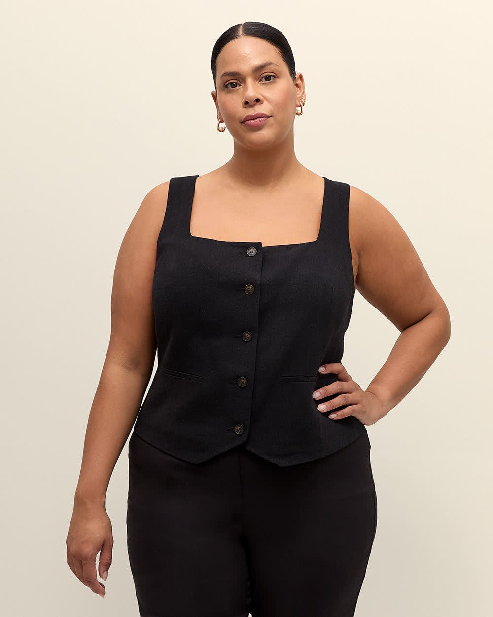 élégant et féminin, cette veste sans manches taille plus revisite le style habillé avec modernité. Confectionné dans un tissu tissé, il offre une silhouette structurée sublimée par une fermeture boutonnée et de fausses poches passepoilées. Son décolleté carré apporte une touche contemporaine qui attire le regard. Portez-le seul pour un look audacieux ou superposé pour un style plus classique. Caractéristiques - Fini tissé - Couleur unie - Sans manches - Encolure carrée - Devant boutonné - Poches passepoilées décoratives - Coupe ajustée - Longueur : 26 po