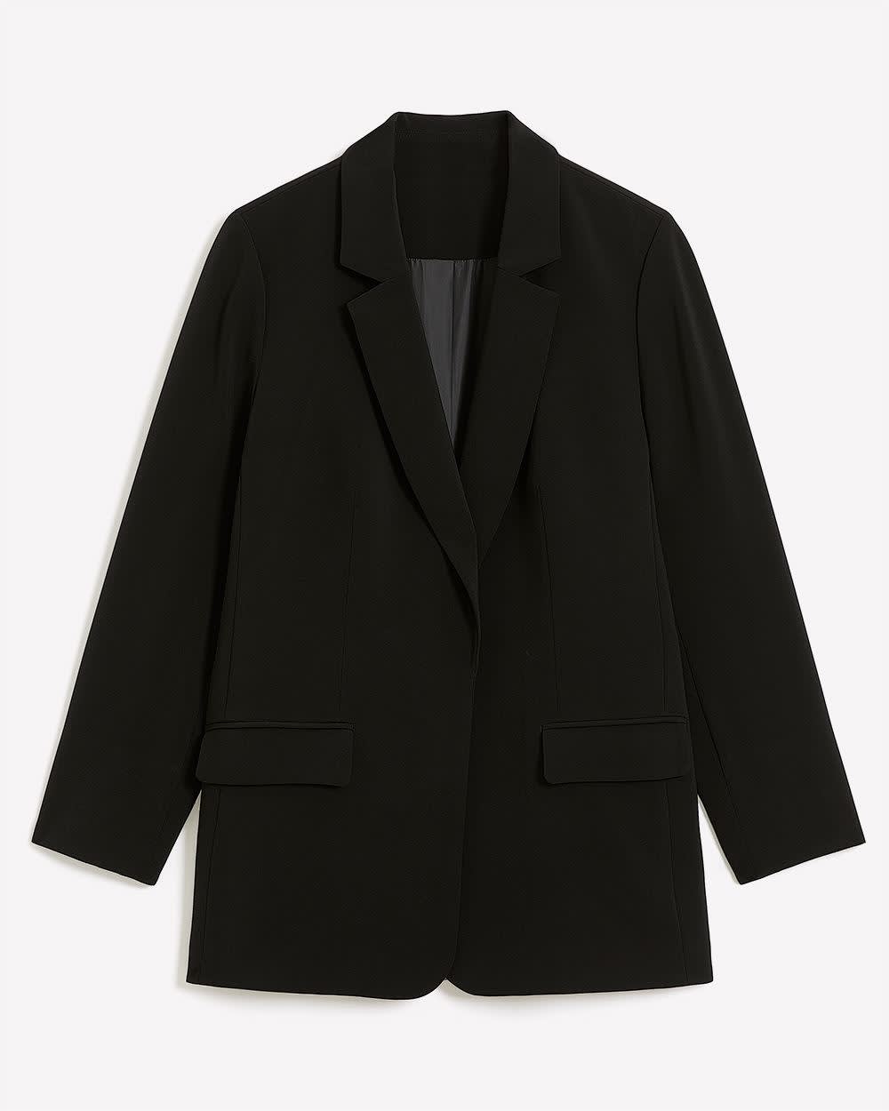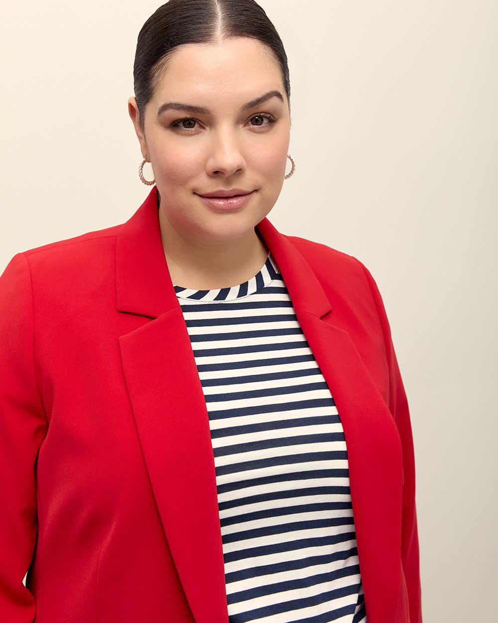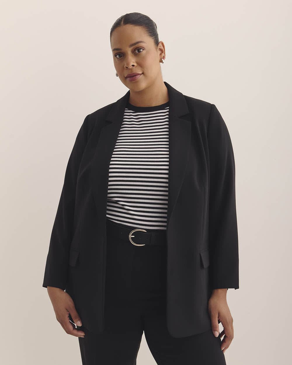 Optez pour l'élégance moderne cette saison avec ce veston taille plus qui fera tourner les têtes. Grâce à sa couleur passe-partout, à sa coupe ajustée et à son look sans bouton, vous pouvez le porter avec un jean et un chemisier ou encore avec une jupe droite pour un style chic, professionnel et toujours confortable.