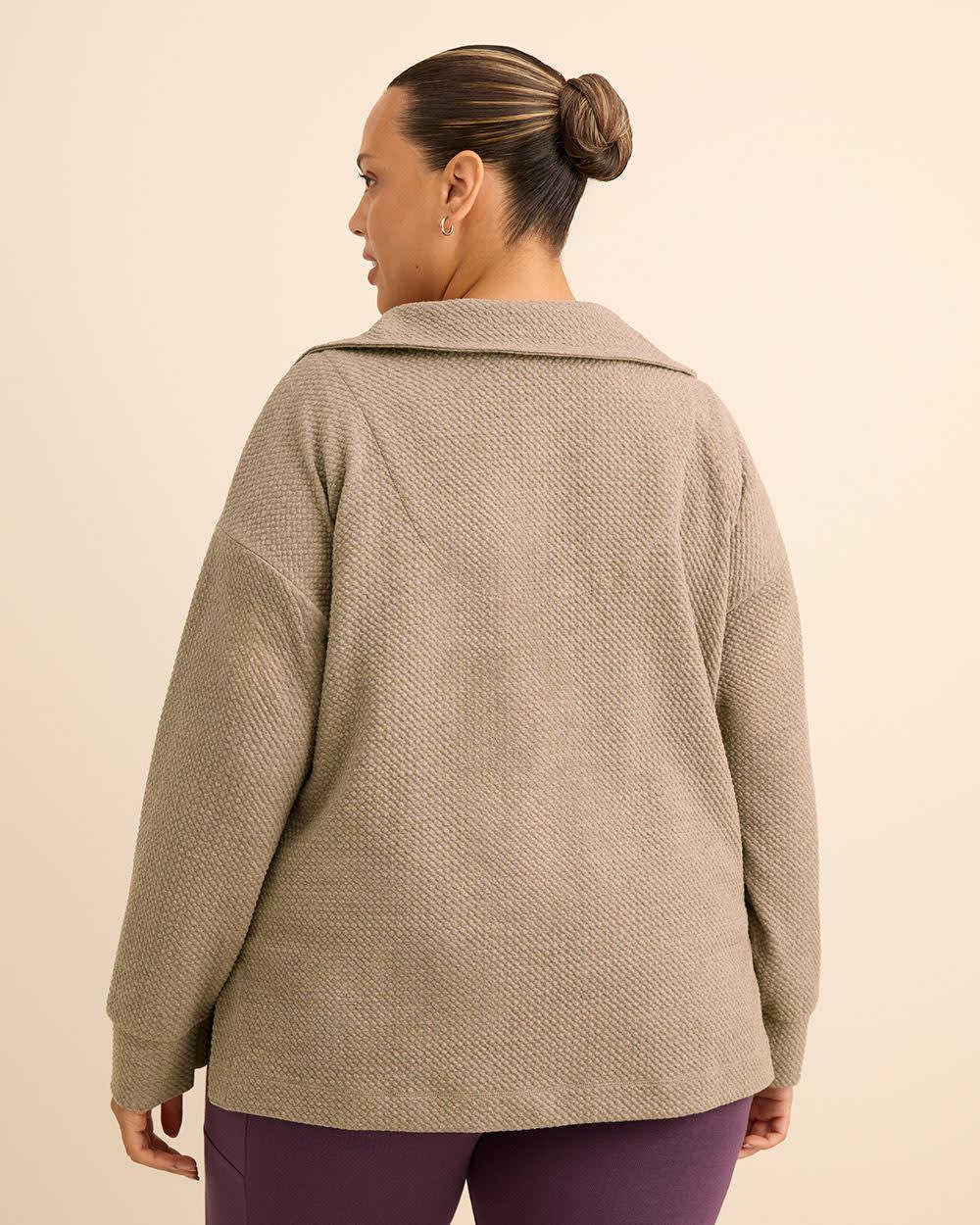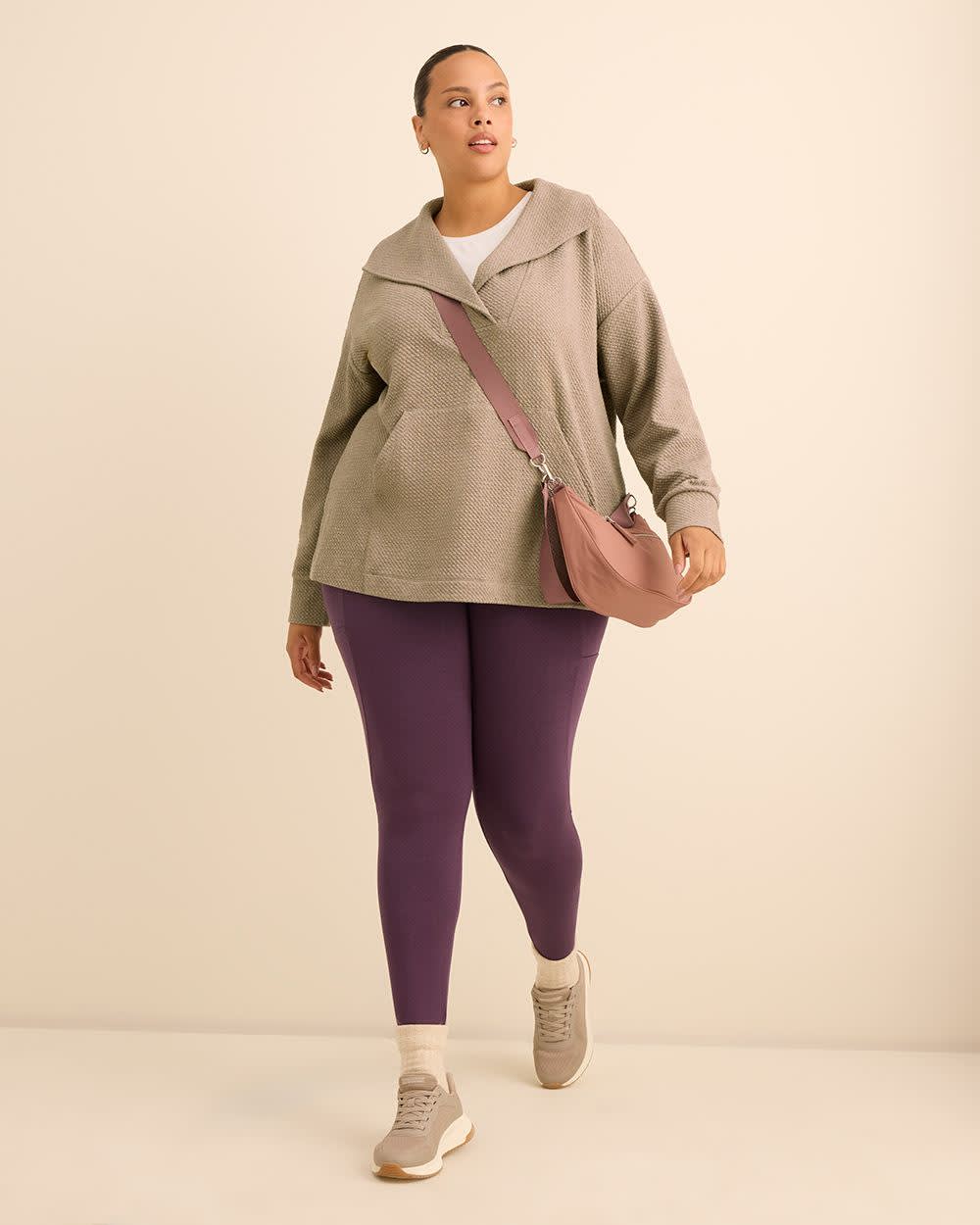 Affichez un style à la fois tendance et décontracté avec ce chandail texturé taille plus à large col. Sa poche kangourou et ses fentes latérales en font un mélange idéal de confort et d'élégance détendue.