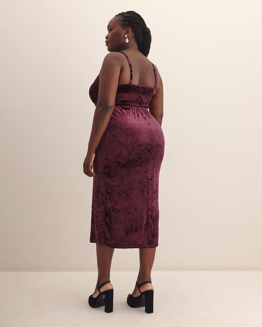 Faites sensation avec cette robe midi taille plus en velours foncé, sublimée par un décolleté en V bordé de dentelle. Sa coupe évasée et son fini luxueux en font un choix irrésistible pour vos soirées glamour.