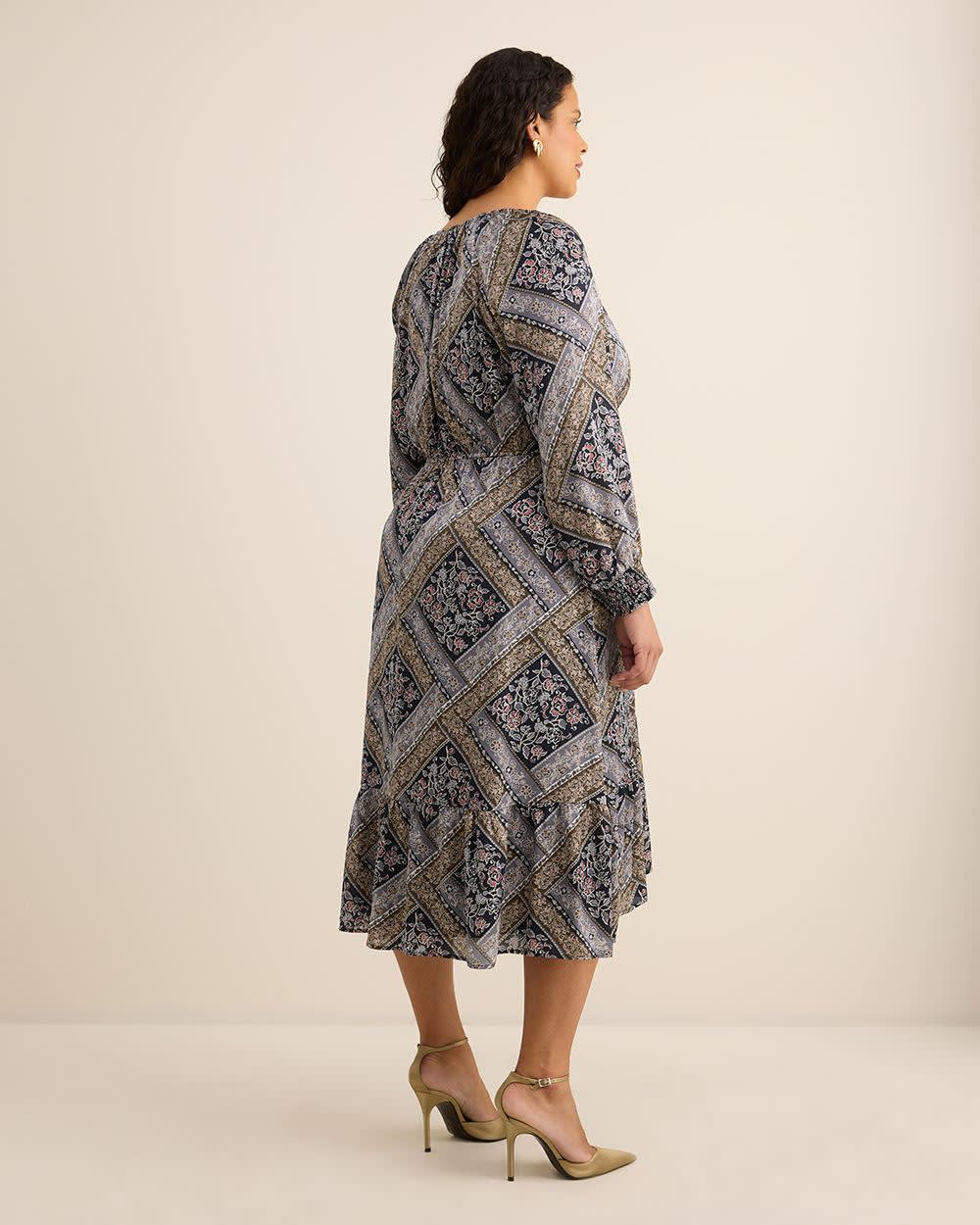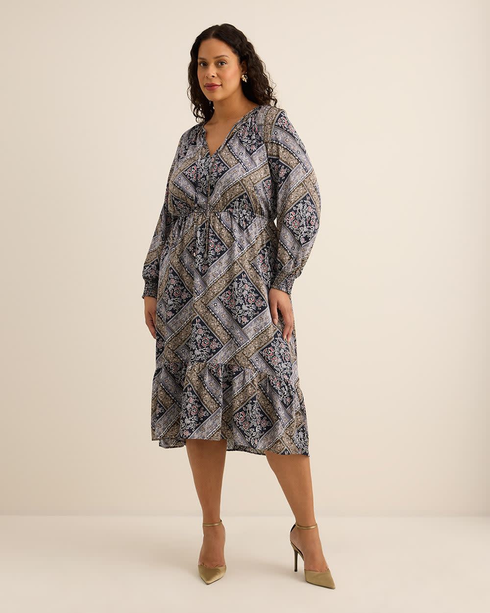 Apportez une touche bohème à votre garde-robe avec cette robe midi taille plus à motif de courtepointe. Ses manches bouffantes, sa jupe à volants et sa coupe évasée offrent un style décontracté au charme ludique.