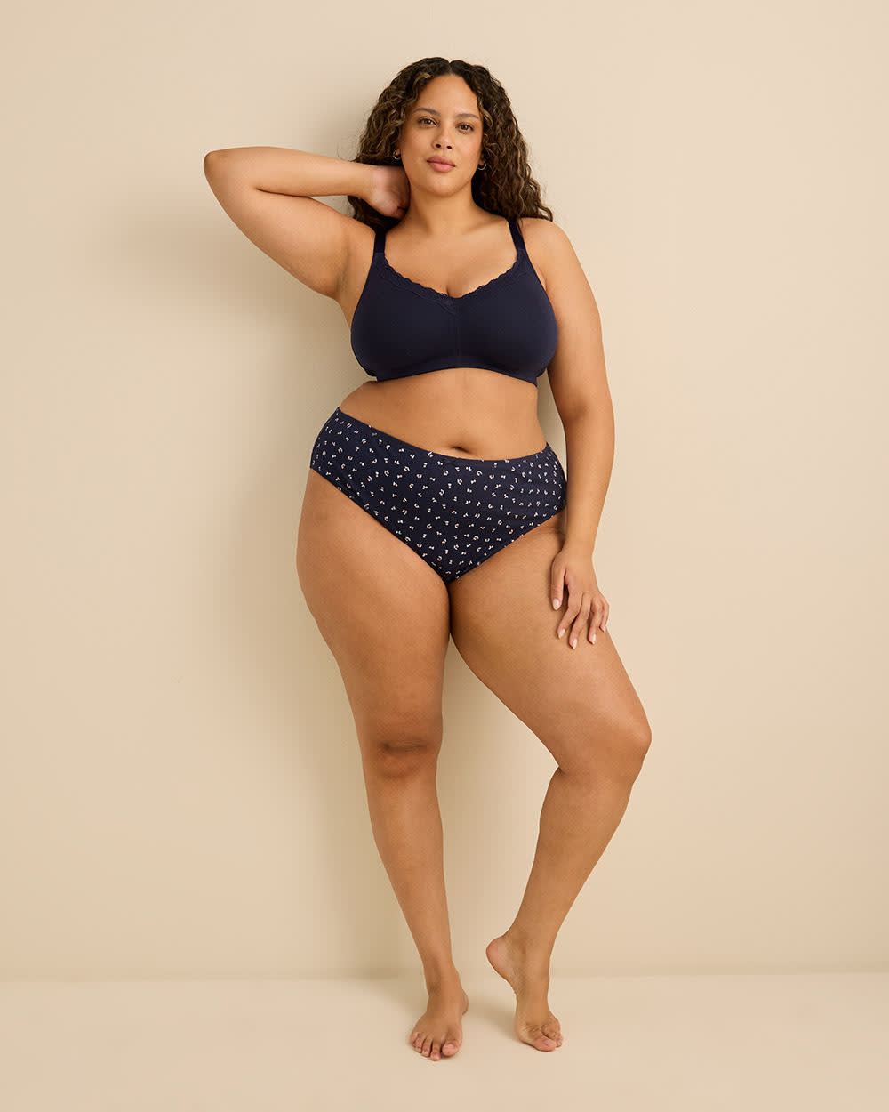 Alliez soutien et style avec ce soutien-gorge taille plus sans armatures en coton bleu foncé. Sa bande de dentelle apporte une touche élégante, tandis que ses bonnets souples non doublés et son confort extensible en font un favori du quotidien.