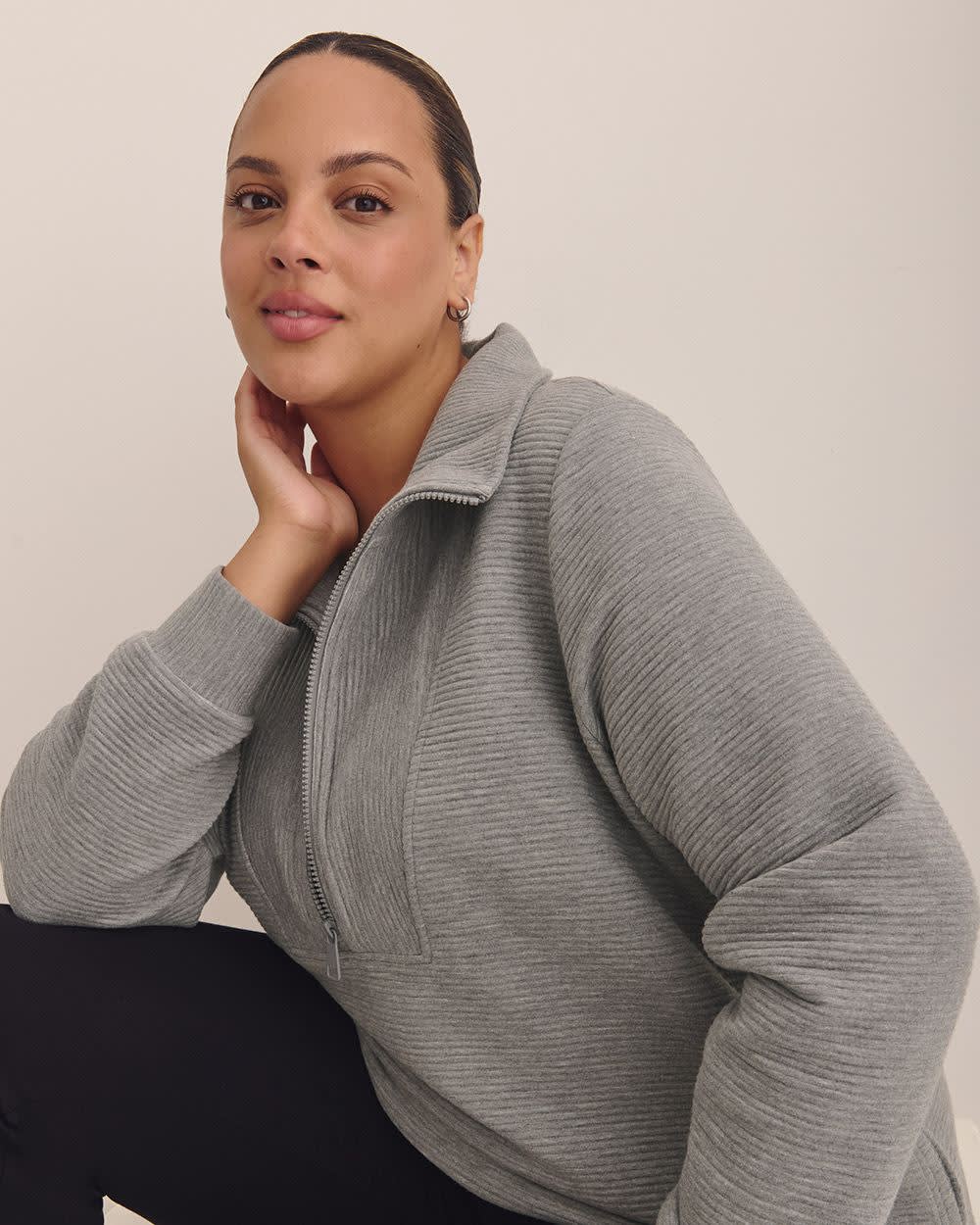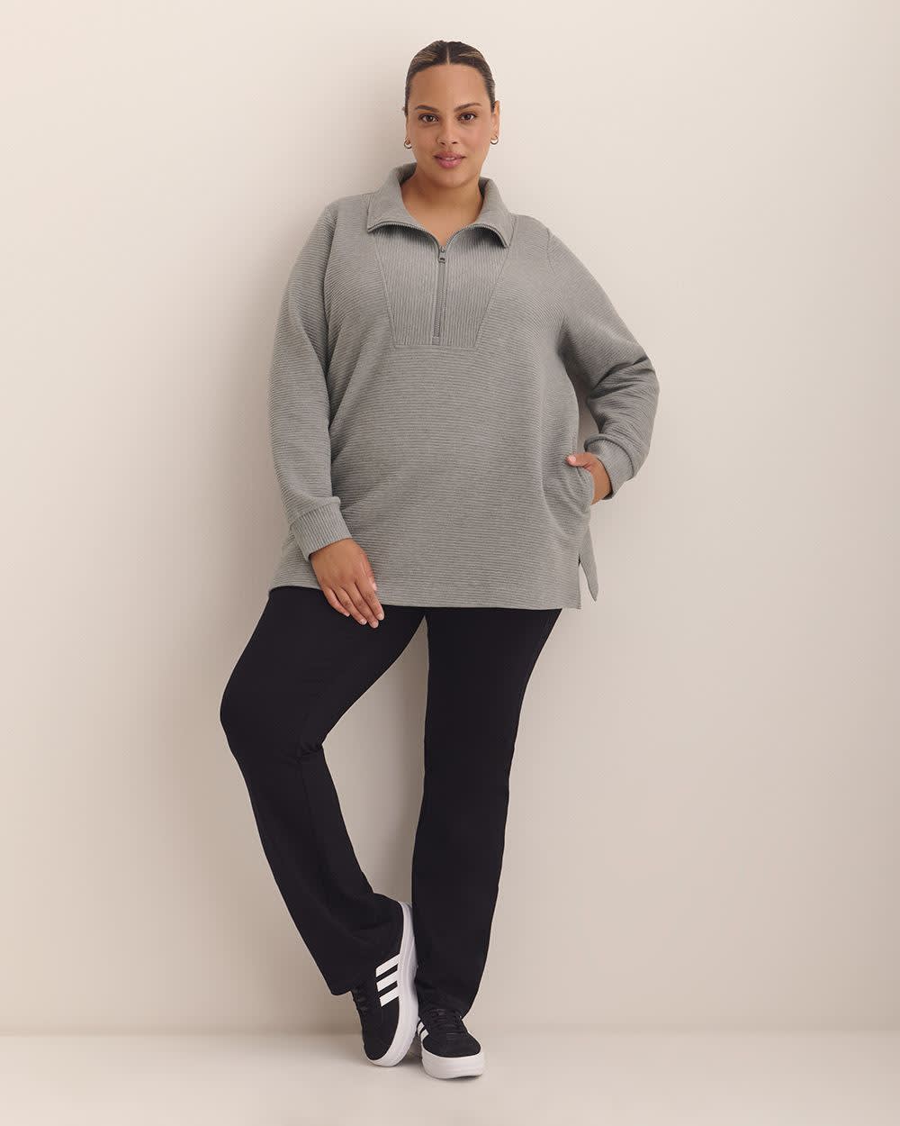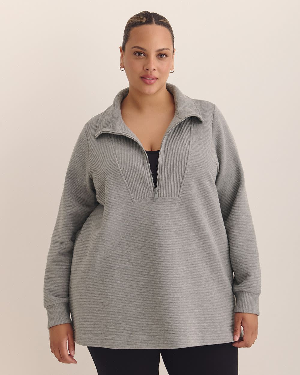 Vous allez adorer ce sweatshirt douillet taille plus pour vos moments décontractés. Avec son fini chiné texturé, son col cheminée à fermeture éclair et sa longueur tunique, comment ne pas l'aimer?