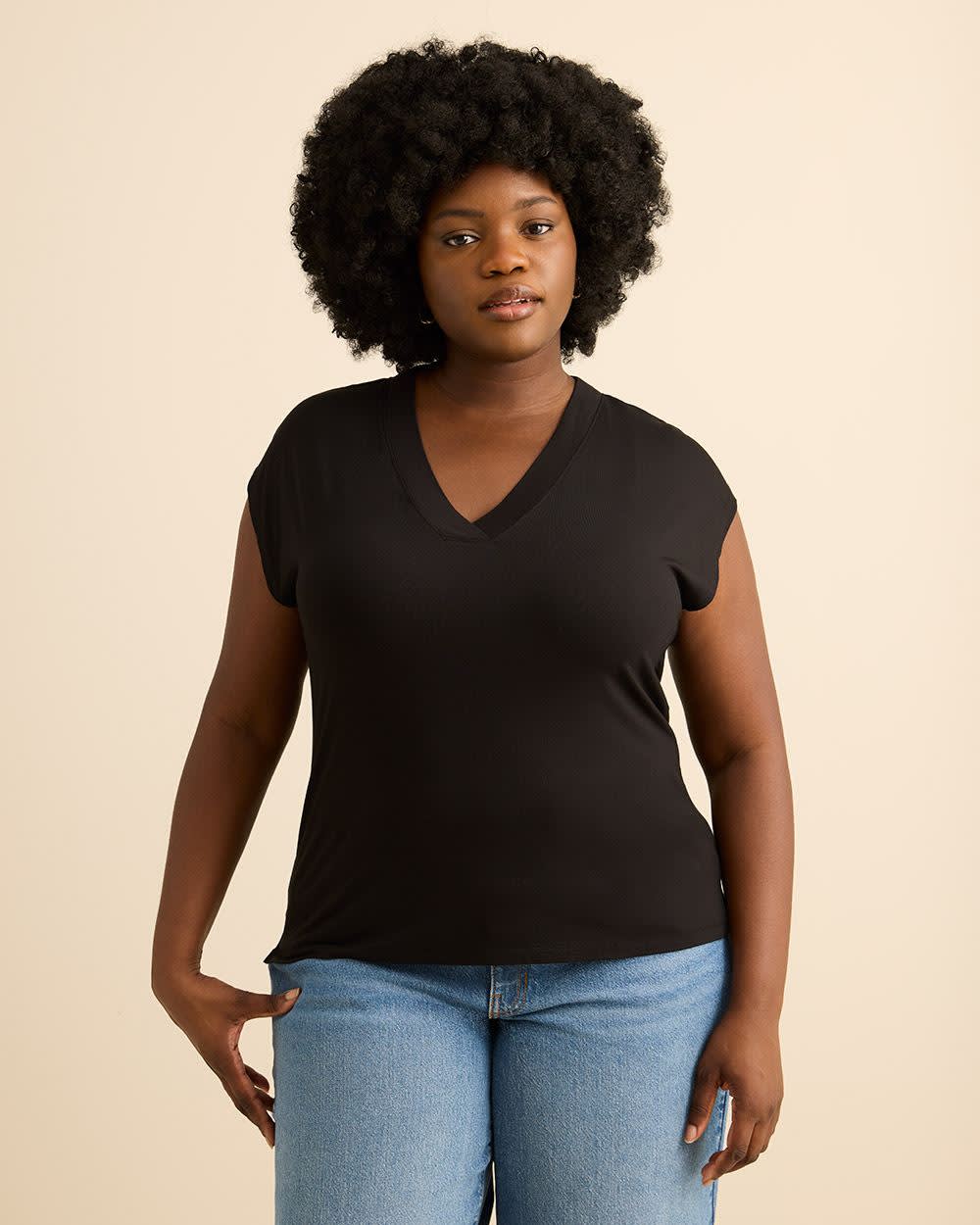 Réinventez vos essentiels du quotidien avec ce t-shirt taille plus à col en V et coupe moderne. Doux, extensible et flatteur, il allie confort absolu et style contemporain grâce à ses manches très courtes.