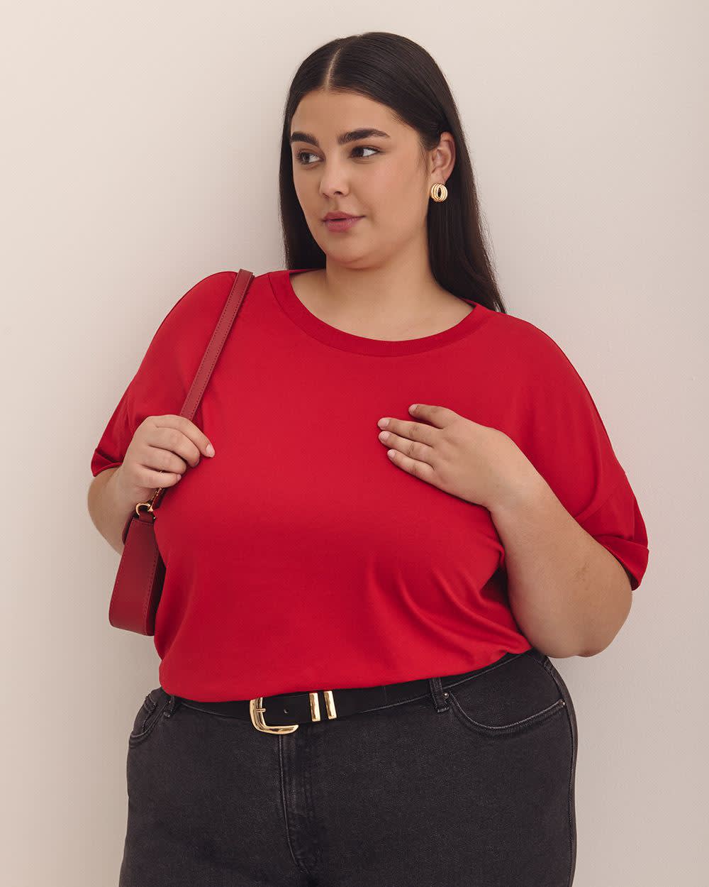 Classique, tendance et confortable. Ce t-shirt taille plus classique à manches courtes et col rond est conçu dans une coupe carrée tendance qui en fait le haut parfait tout au long de l'année. Parfait avec des leggings ou des pantalons en molleton, il s'agence aussi joliment à vos jeans taille haute.
