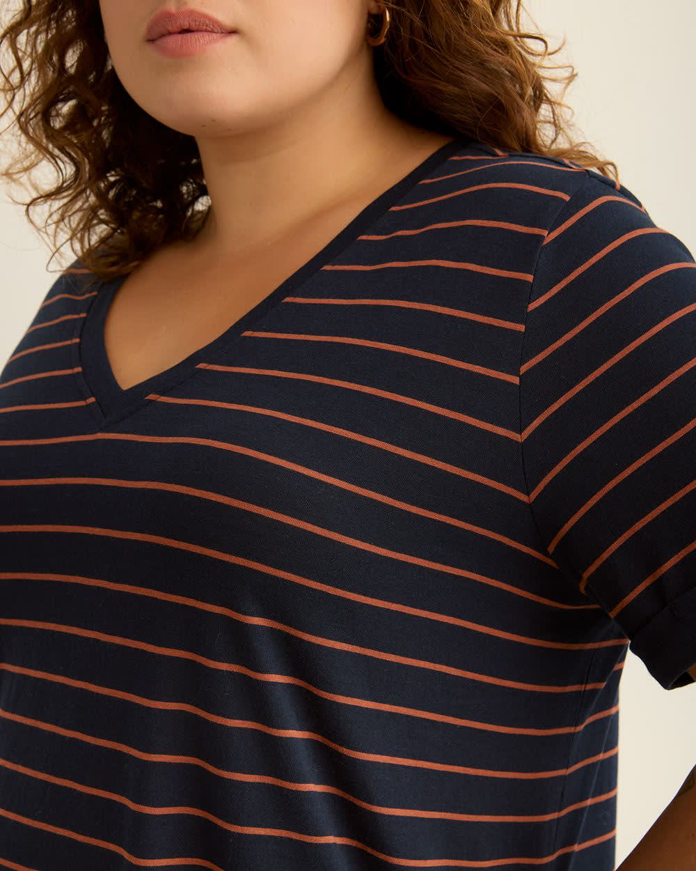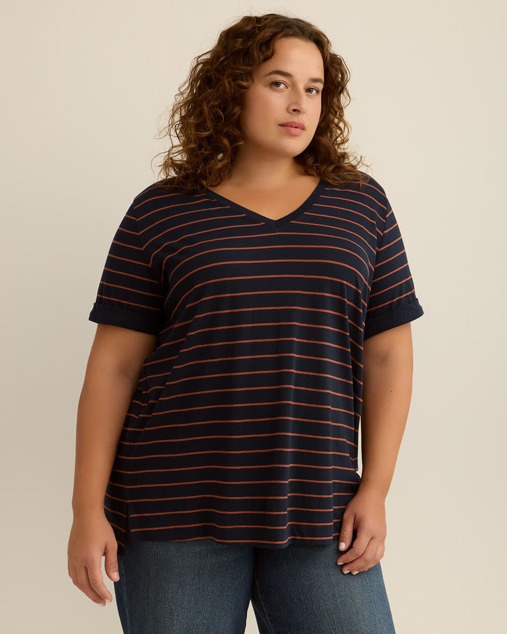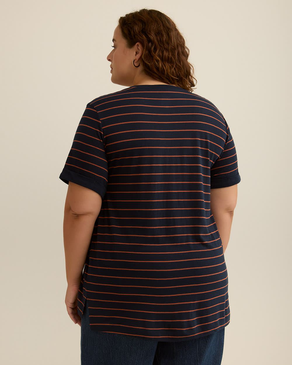 Classique, tendance et agréable à porter. Doté de fentes sur les côtés pour un style confortable, ce t-shirt rayé taille plus à manches courtes est assurément un morceau de base à garder à portée de main, quelle que soit la saison. Parfait à porter avec un jean, une jupe ou un pantalon, ce t-shirt ample taille plus en jersey de coton est un choix facile.