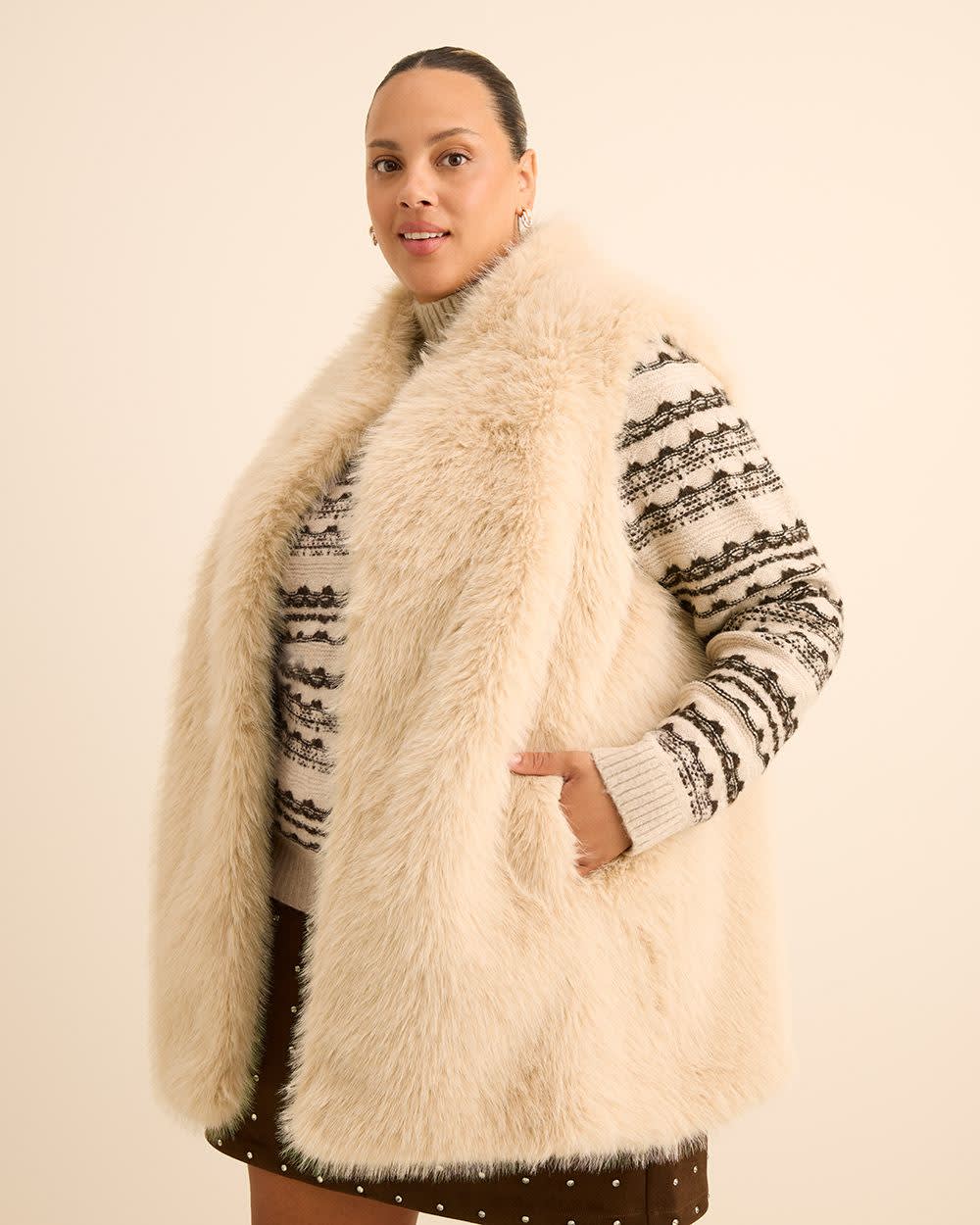 Enveloppez-vous de style luxueux cette saison. Ce par-dessus sans manches en fausse fourrure taille plus vous gardera au chaud tout en vous donnant du style pendant les mois d'automne. Portez-le ouvert pour montrer votre tenue ou fermé pour vous protéger du vent frisquet.