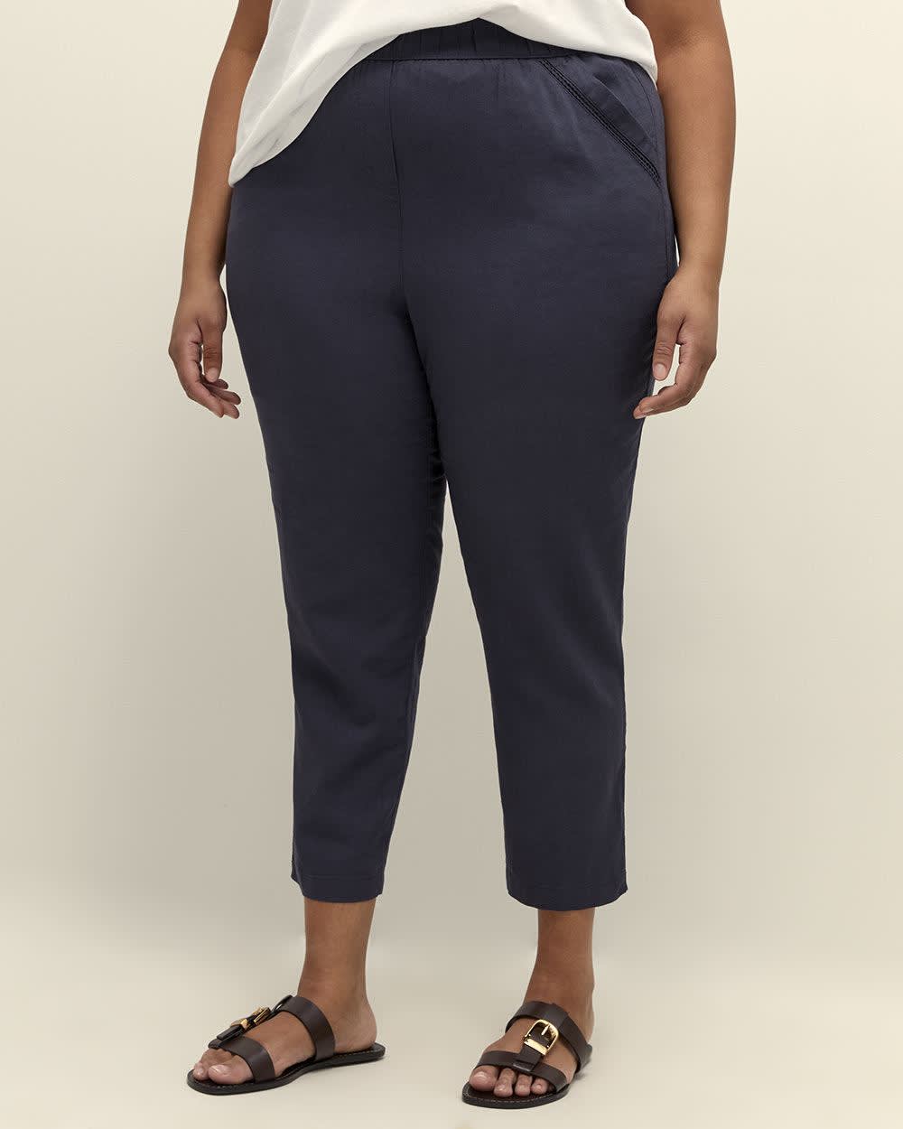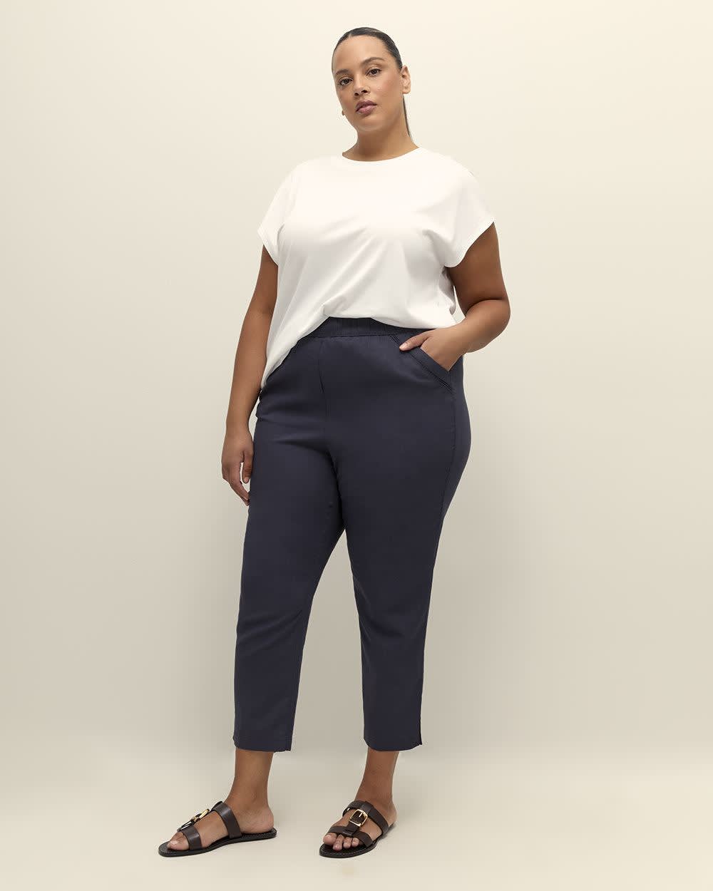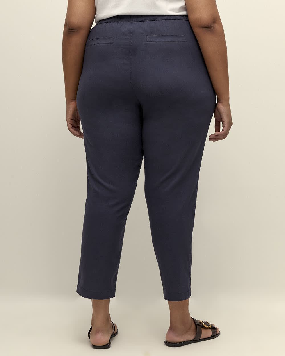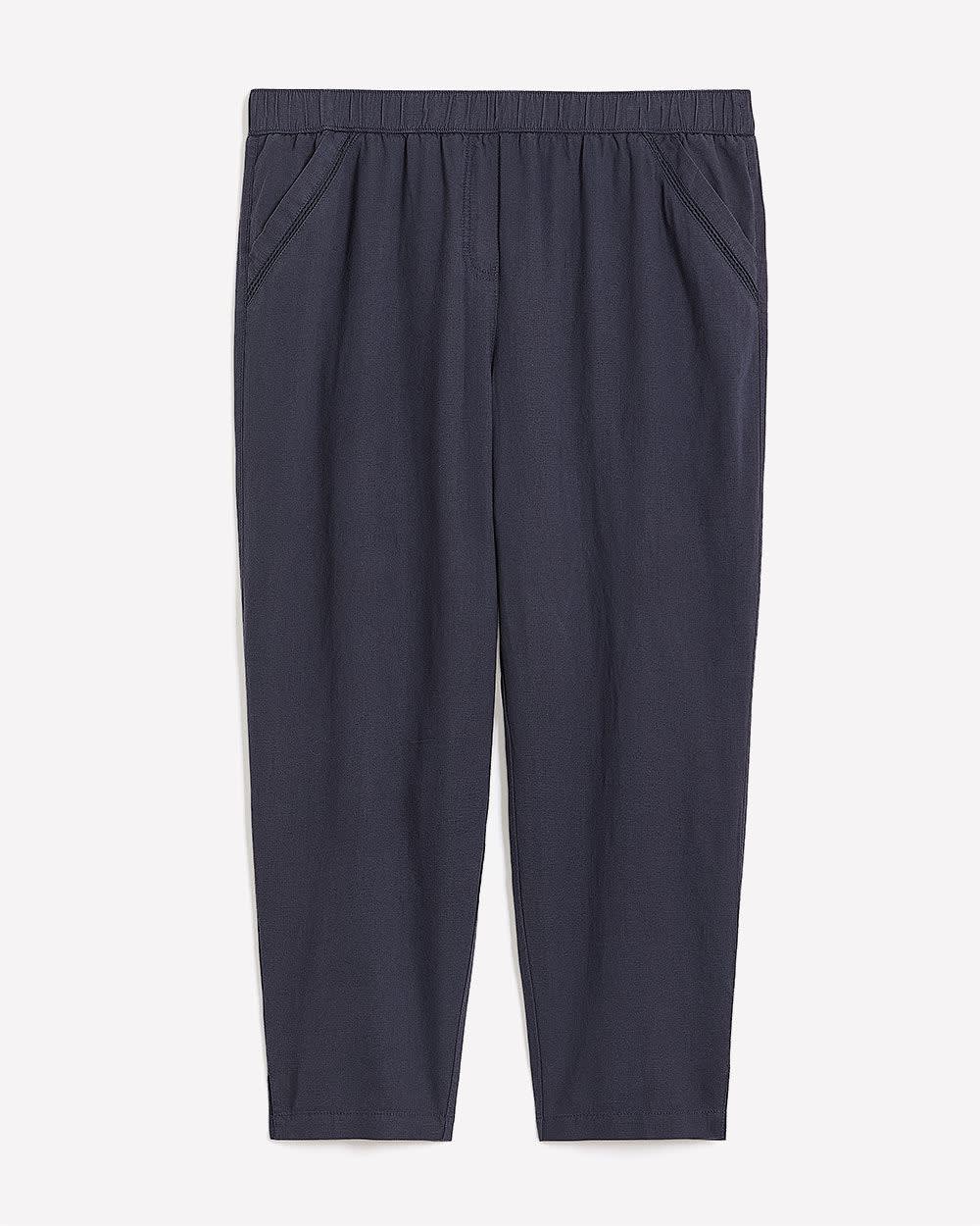 Whenever you want a bottom that combines comfort and style, slip into these plus-size pants made of a lightweight, breathable linen blend with a stylish tapered-leg silhouette. Featuring an elastic waistband, slanted pockets at the front and decorative reese pockets at the back, they will be a great addition to your wardrobe.
