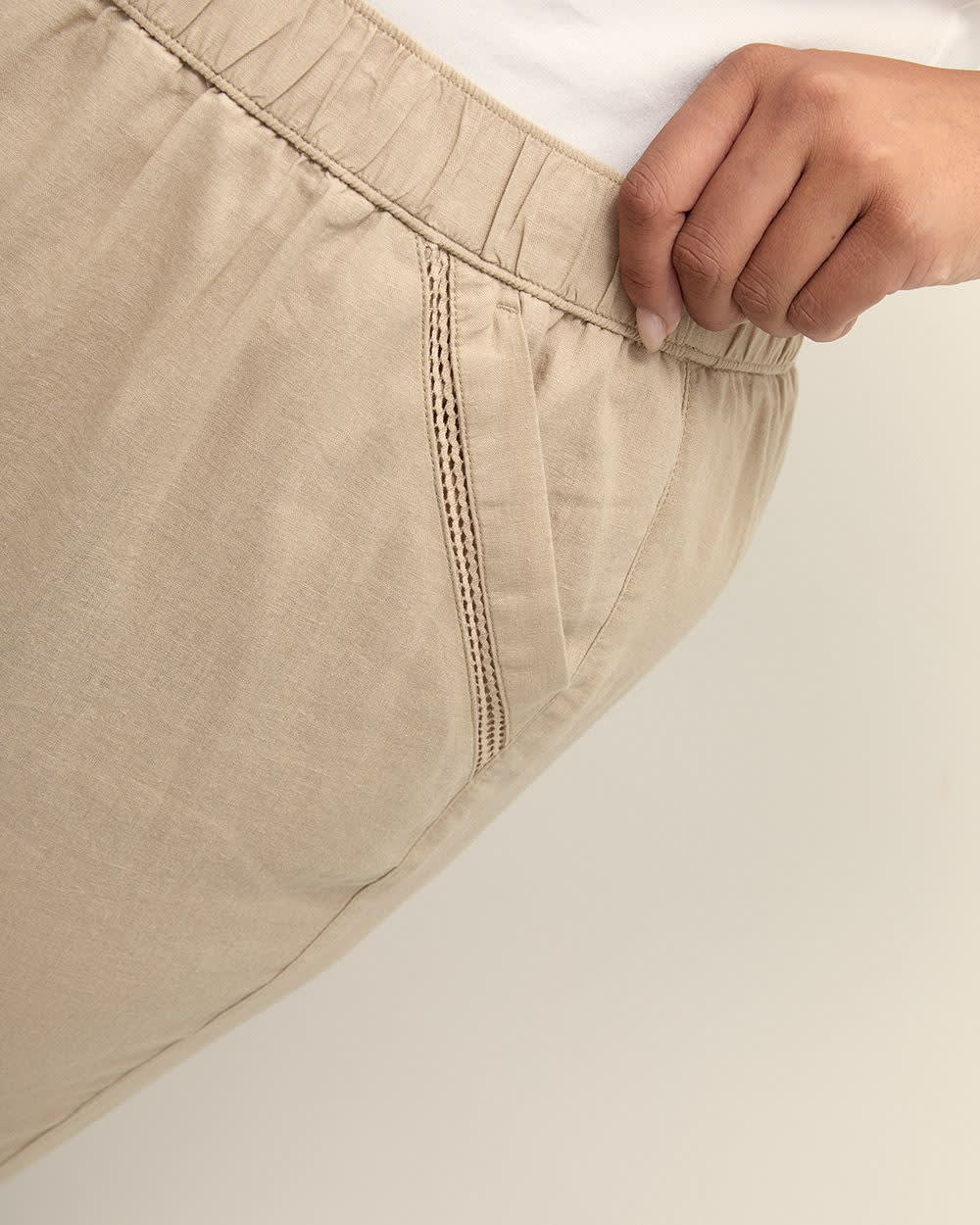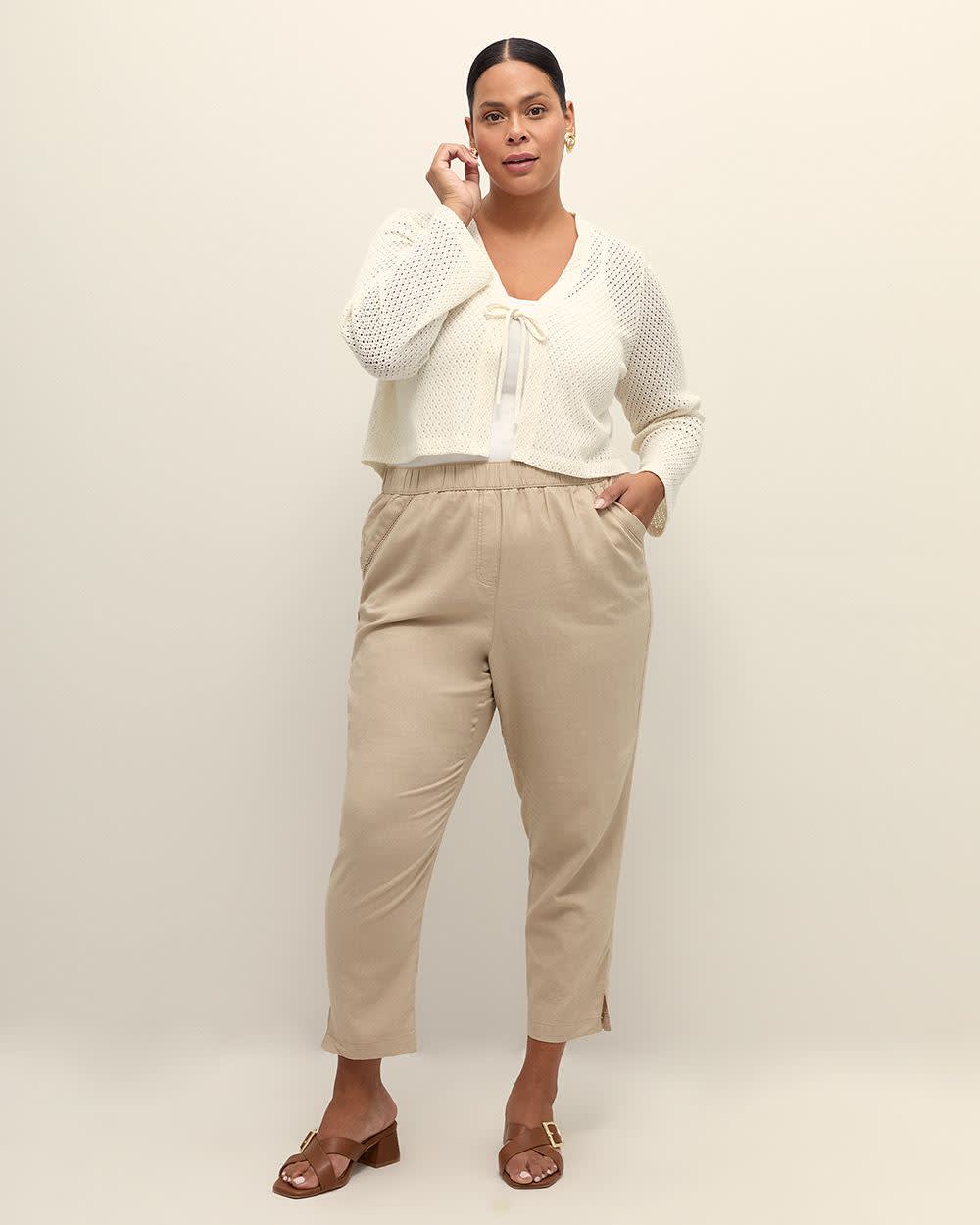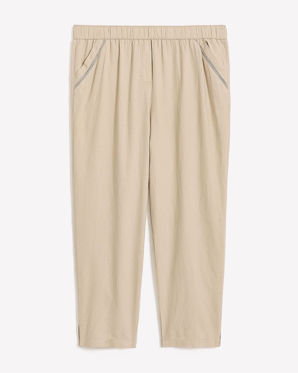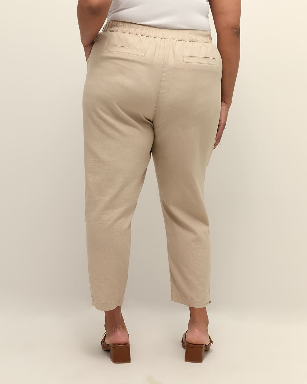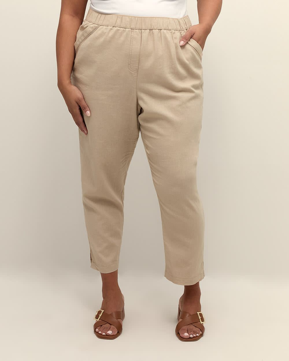 Whenever you want a bottom that combines comfort and style, slip into these plus-size pants made of a lightweight, breathable linen blend with a stylish tapered-leg silhouette. Featuring an elastic waistband, slanted pockets at the front and decorative reese pockets at the back, they will be a great addition to your wardrobe.