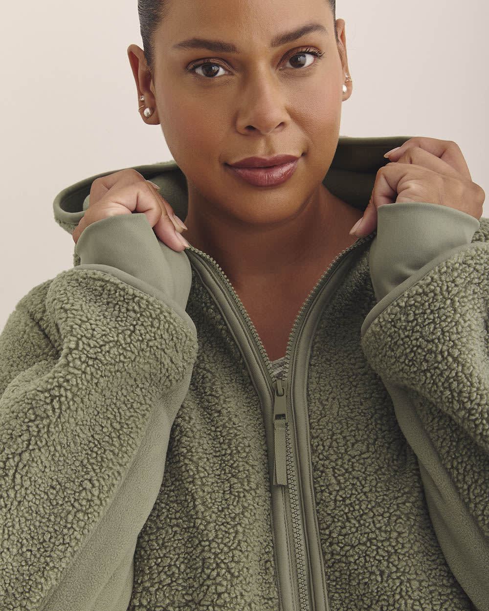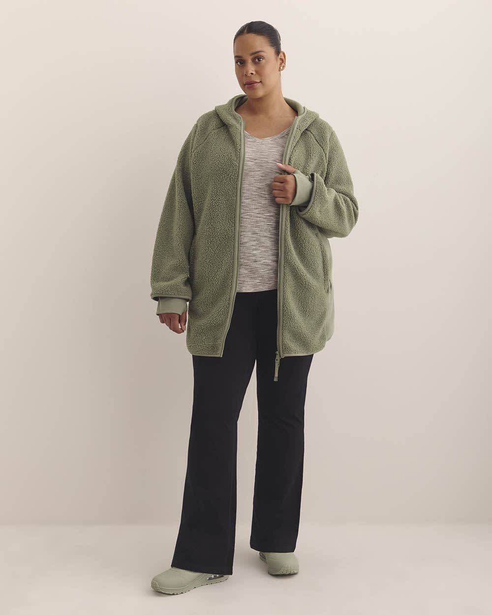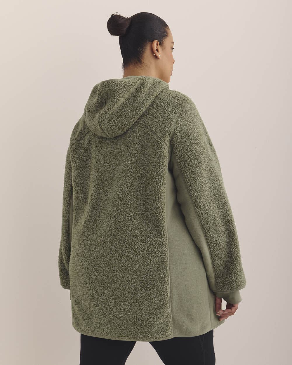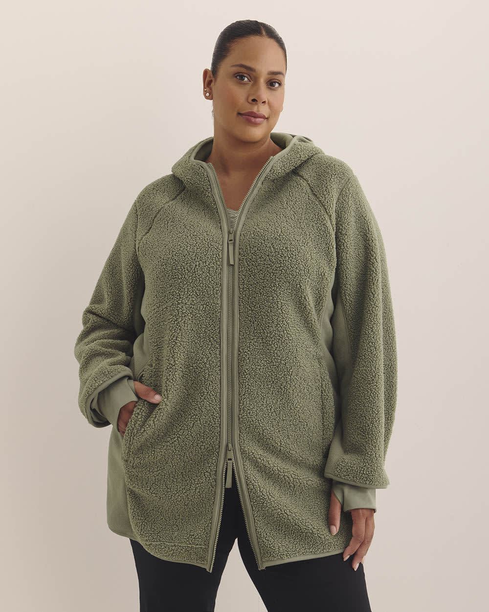 Don't let the cold weather stop you! Made of soft sherpa for some extra warmth, this cozy plus-size long-length jacket will keep the chill out and the warmth in, all thanks to its hooded design, front zipper opening and hand pockets.