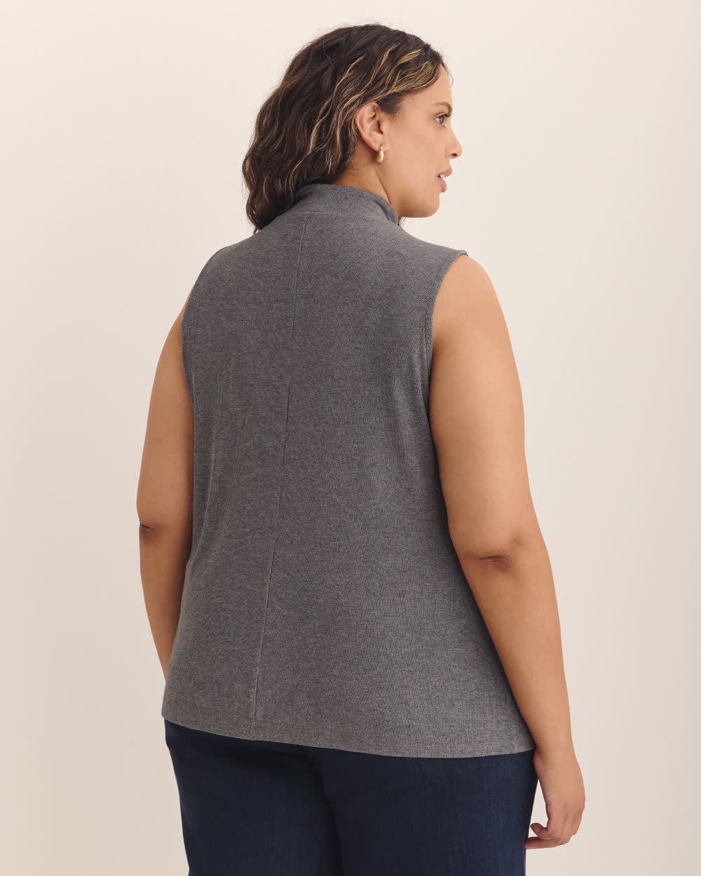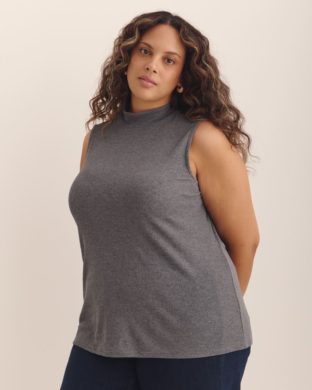 For a modern yet classic top, try this plus-size sleeveless tank top! Boasting a trendy ribbed knit finish for a touch of texture and an elegant mock neckline, this modern-looking cami will provide you with a cozy everyday style. Perfect for layering with a blazer or cardigan.