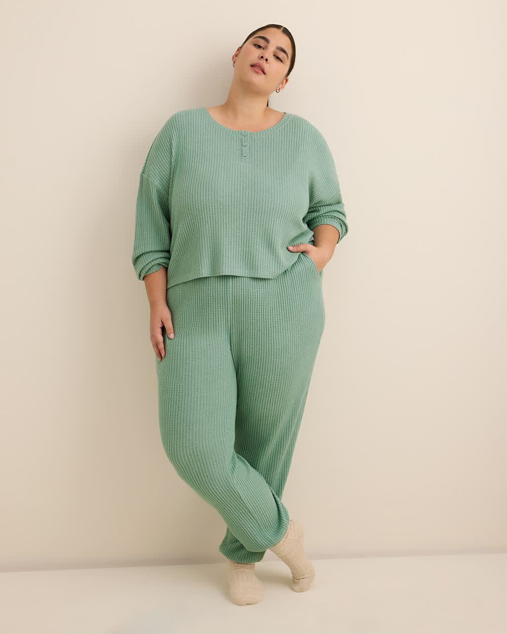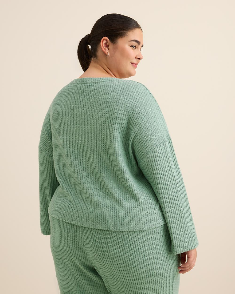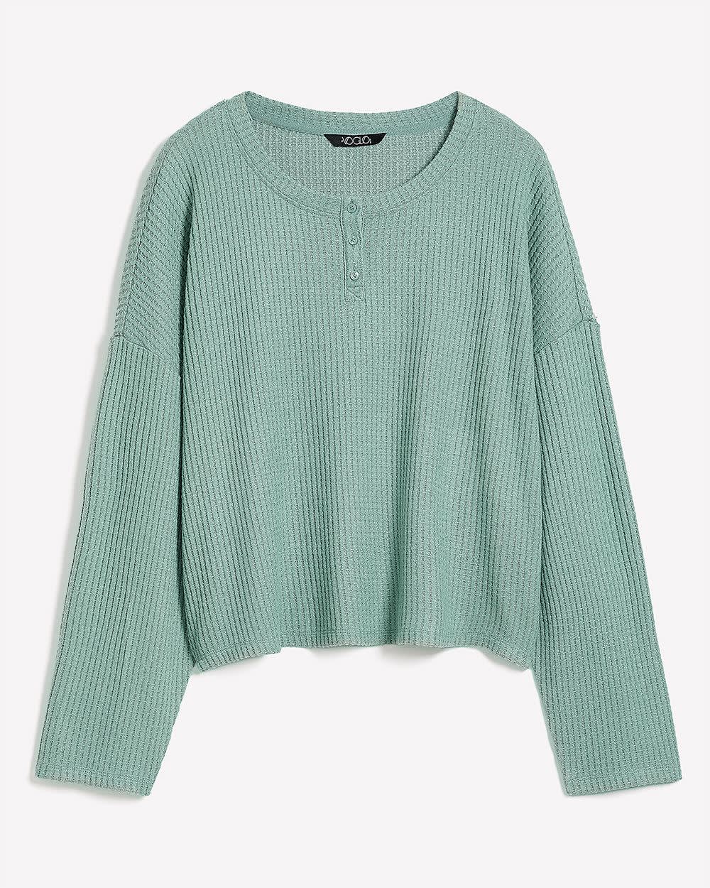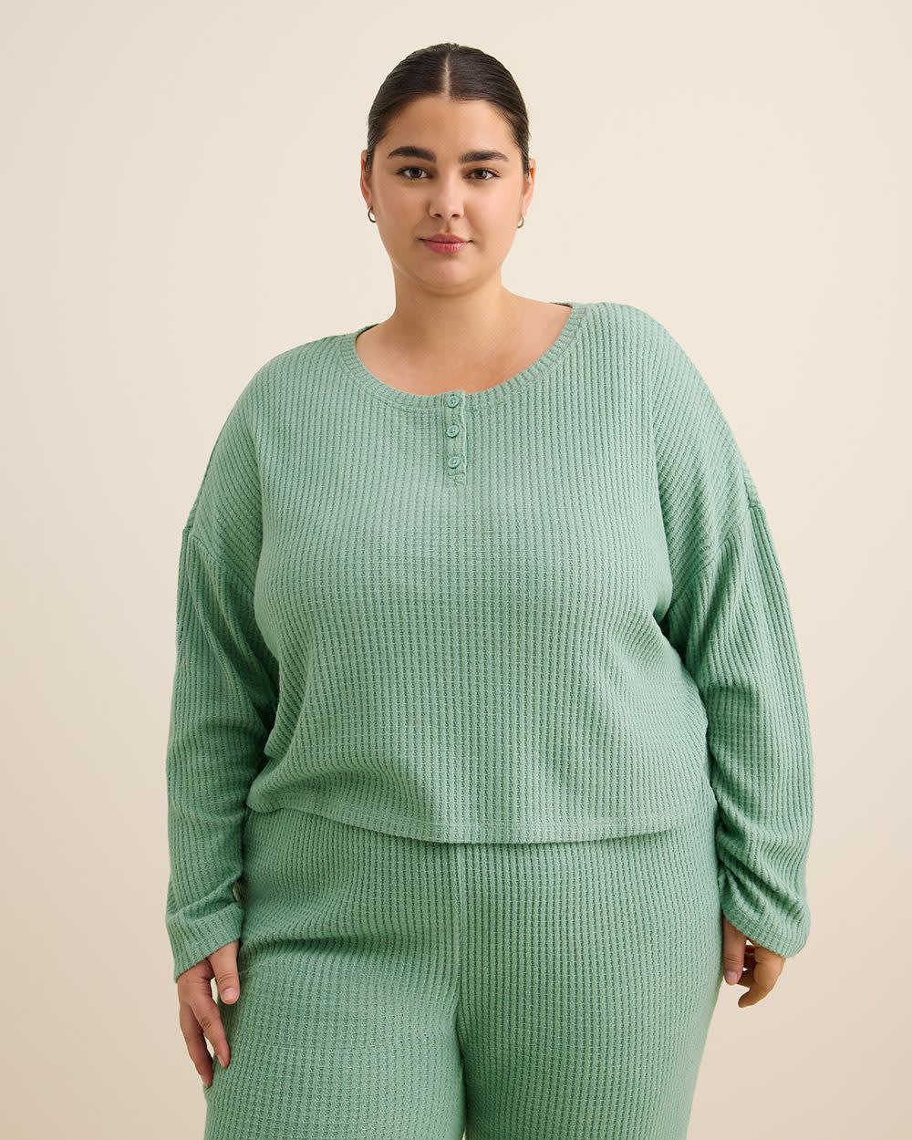 Get comfy in style with this plus-size long-sleeve cropped pyjama top made of soft waffle knit. Featuring a button placket and relaxed fit, it's perfect for lounging with ease.